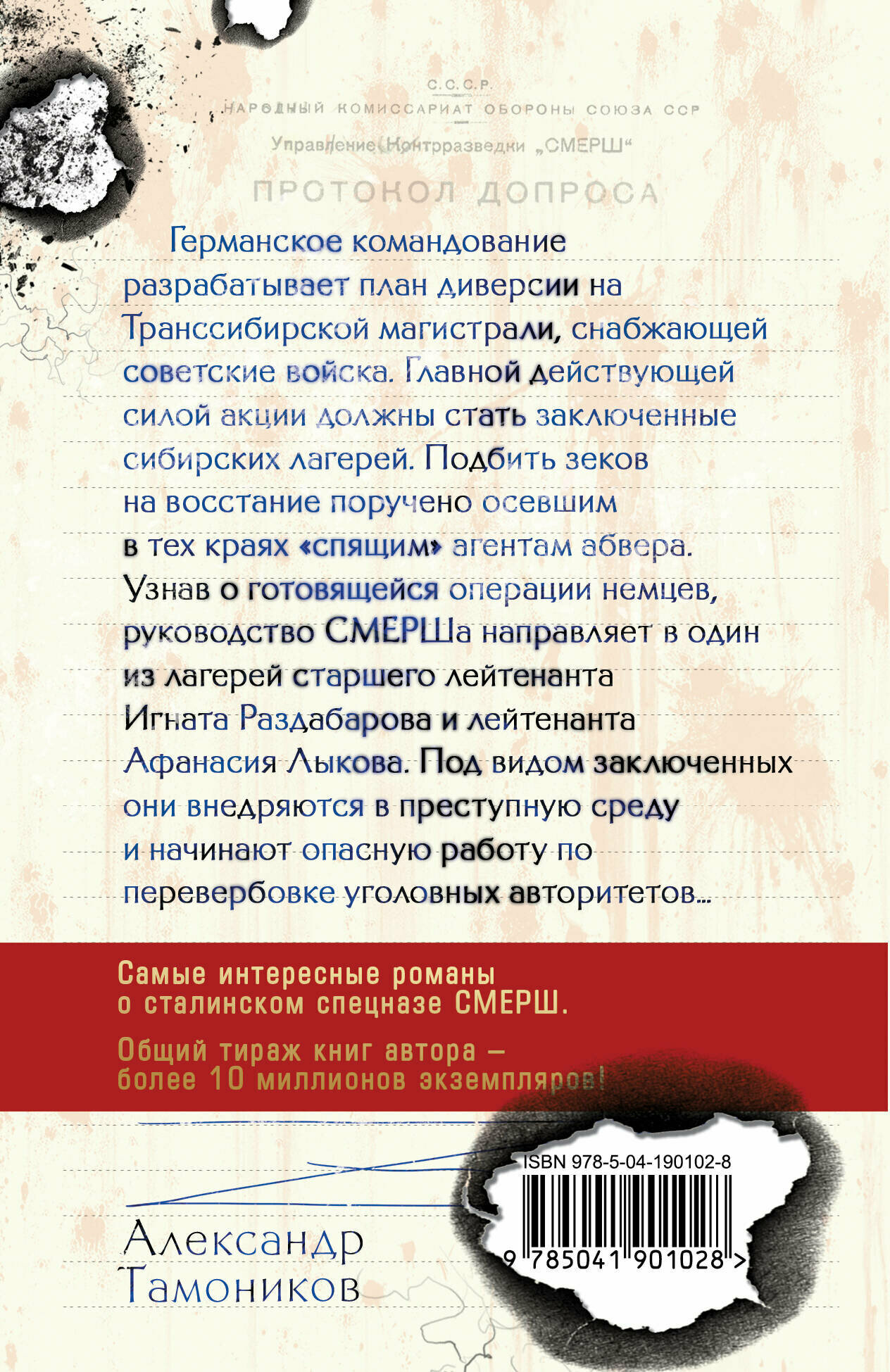 Самые интересные романы о сталинском спецназе — СМЕРШе. Германское командование разрабатывает план диверсии на Транссибирской магистрали, снабжающей советские войска. Главной действующей силой акции должны стать заключенные сибирских лагерей. Подбить зэков на восстание поручено осевшим в тех краях «спящим» агентам абвера. Узнав о готовящейся операции немцев, руководство СМЕРШа направляет в один из лагерей старшего лейтенанта Игната Раздабарова и лейтенанта Афанасия Лыкова. Под видом заключенных они внедряются в преступную среду и начинают опасную работу по перевербовке уголовных авторитетов… «Смерть шпионам!» (СМЕРШ) — это короткое и беспощадное название носило особое подразделение НКВД, подчинявшееся И. Сталину. Созданное в годы войны, оно состояло из проверенных в бою, честных и бесстрашных офицеров Красной Армии. СМЕРШа боялись все — и фашистские лазутчики, готовящие диверсии в наших боевых порядках, и гитлеровские приспешники, действующие в глубоком советском тылу. Враг знал: если на его след напали бойцы сталинского спецназа, справедливого и скорого суда не избежать. Романы серии «СМЕРШ — спецназ Сталина» — это каждый раз увлекательный динамичный сюжет и новые исторические знания, это экшен, написанный простым и понятным языком. Общий тираж книг А. Тамоникова — более 10 миллионов экземпляров!
