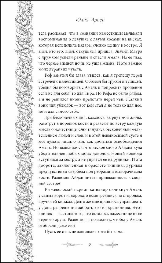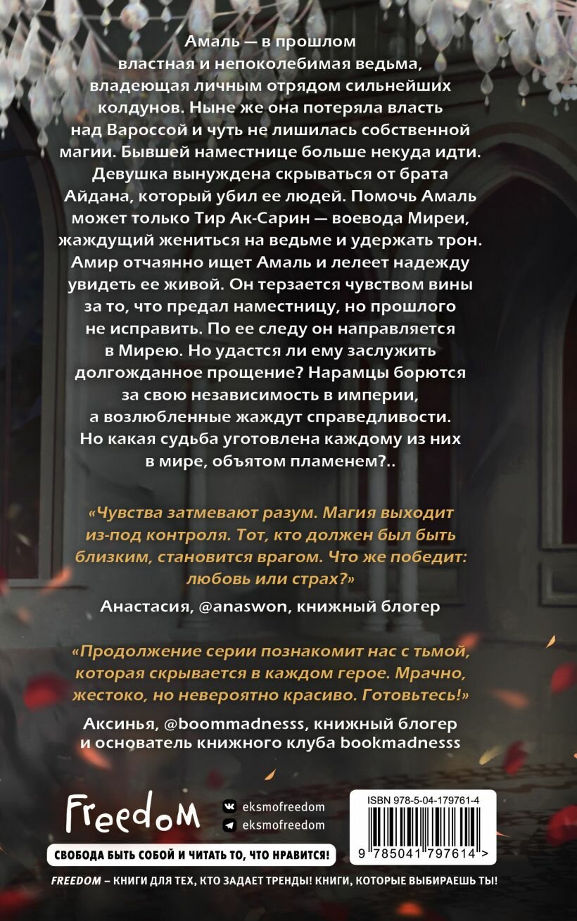 Амаль — в прошлом властная и непоколебимая ведьма, владеющая личным отрядом сильнейших колдунов. Ныне же она потеряла власть над Вароссой и чуть не лишилась собственной магии. Бывшей наместнице больше некуда идти. Девушка вынуждена скрываться от брата Айдана, который убил ее людей. Помочь Амаль может только Тир Ак-Сарин – воевода Миреи, жаждущий жениться на ведьме и удержать трон. Амир отчаянно ищет Амаль и лелеет надежду увидеть ее живой. Он терзается чувством вины за то, что предал наместницу, но прошлого не исправить. По ее следу он направляется в Мирею. Но удастся ли ему заслужить долгожданное прощение? Нарамцы борются за свою независимость в империи, а возлюбленные жаждут справедливости. Но какая судьба уготовлена каждому из них в мире, объятым пламенем?..