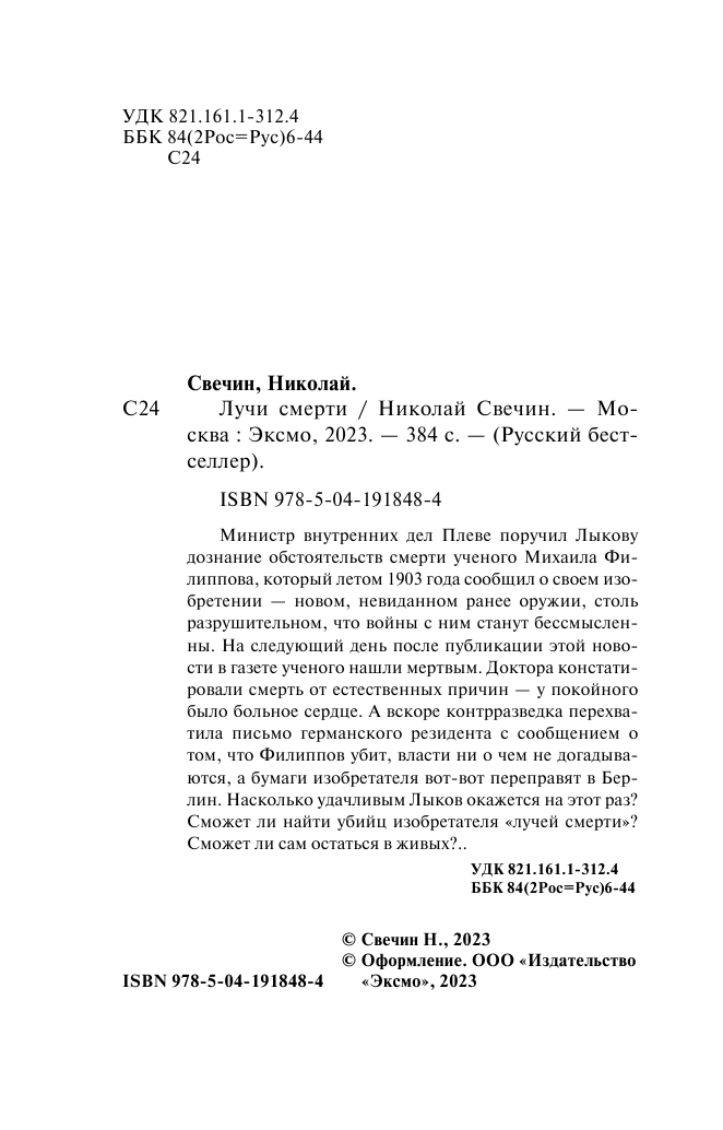 Книга: Лучи смерти (Николай Свечин); Эксмо, Редакция 1, 2024