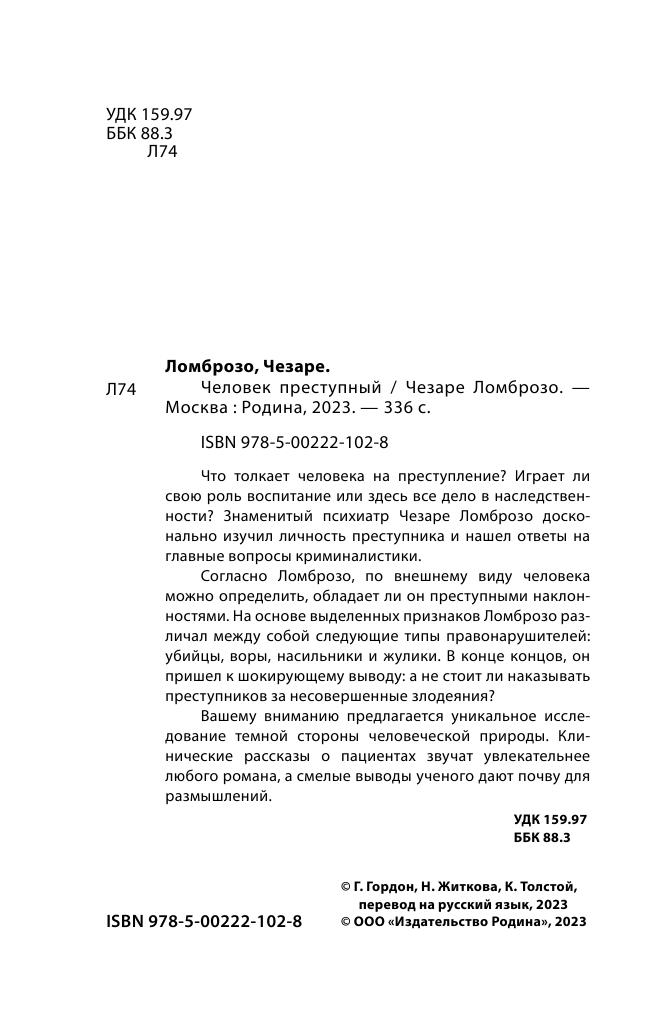 Что толкает человека на преступление? Играет ли свою роль воспитание или здесь все дело в наследственности? Знаменитый психиатр Чезаре Ломброзо досконально изучил личность преступника и нашел ответы на главные вопросы криминалистики. Согласно Ломброзо, по внешнему виду человека можно определить, обладает ли он преступными наклонностями. На основе выделенных признаков Ломброзо различал между собой следующие типы правонарушителей: убийцы, воры, насильники и жулики. В конце концов, он пришел к шокирующему выводу: а не стоит ли наказывать преступников за несовершенные злодеяния? Вашему вниманию предлагается уникальное исследование темной стороны человеческой природы. Клинические рассказы о пациентах звучат увлекательнее любого романа, а смелые выводы ученого дают почву для размышлений.