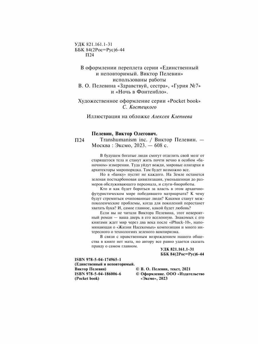 Книга издательства Эксмо. Transhumanism inc. Pocket book 9785041860066 (Пелевин В.О.) (Пелевин Виктор Олегович); ООО "Издательство "Эксмо", 2023