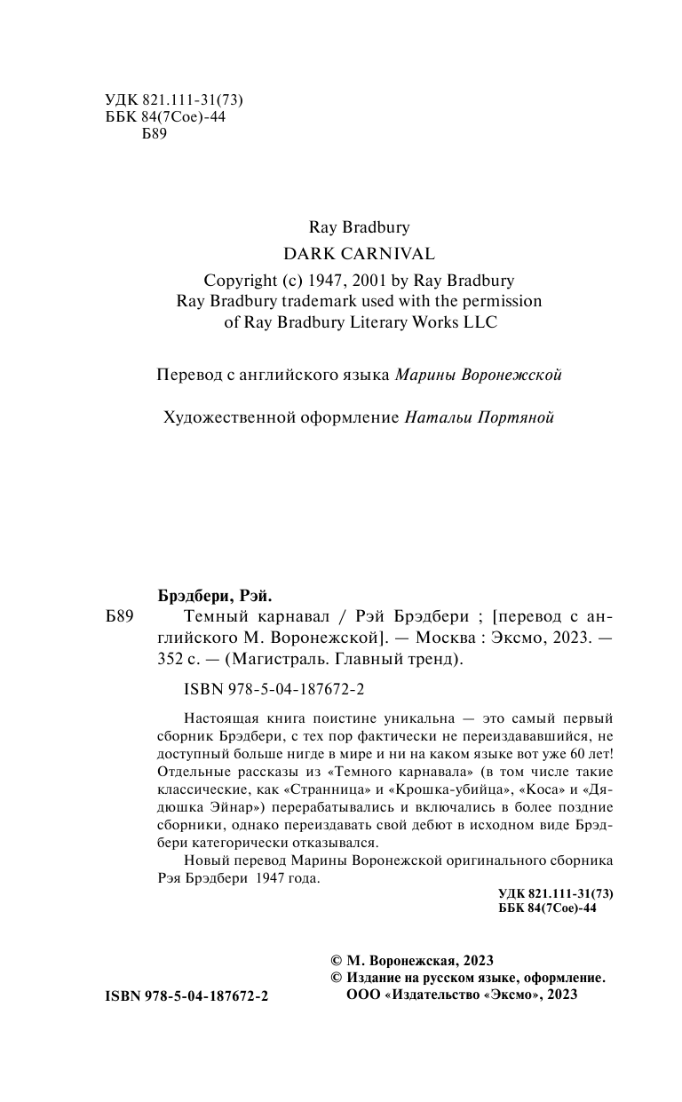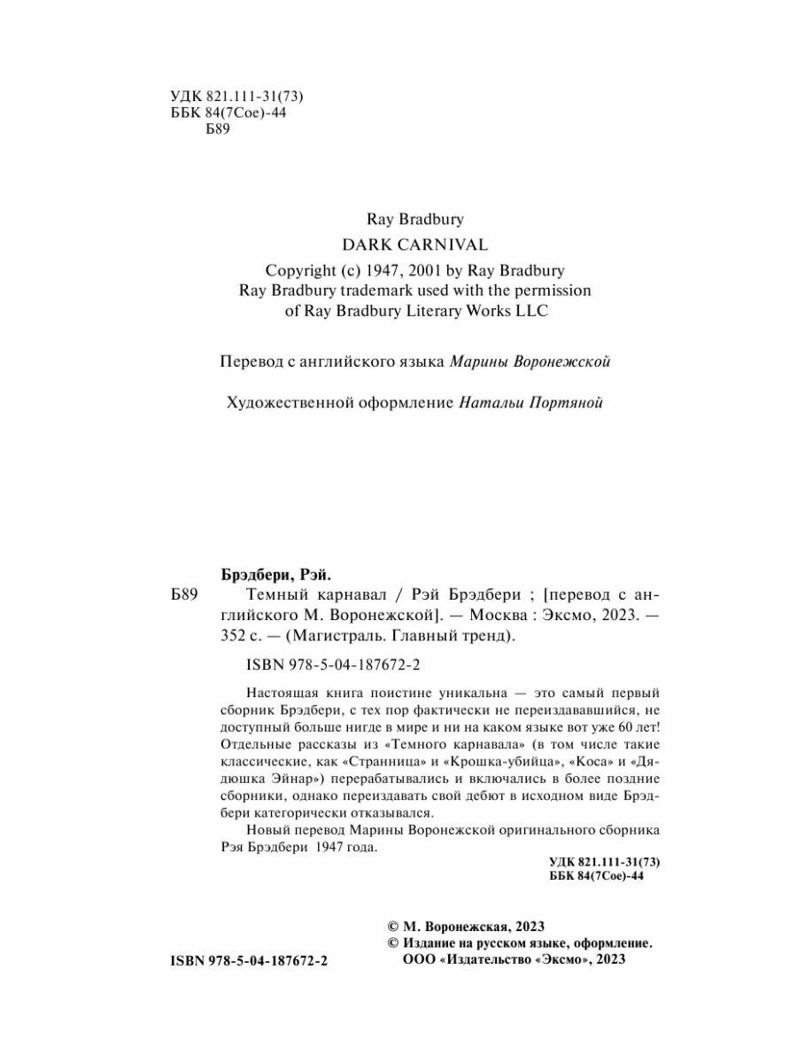 Настоящая книга поистине уникальна — это самый первый сборник Брэдбери, с тех пор фактически не переиздававшийся, не доступный больше нигде в мире и ни на каком языке вот уже 60 лет! Отдельные рассказы из «Темного карнавала» (в том числе такие классические, как «Странница» и «Крошка-убийца», «Коса» и «Дядюшка Эйнар») перерабатывались и включались в более поздние сборники, однако переиздавать свой дебют в исходном виде Брэдбери категорически отказывался.