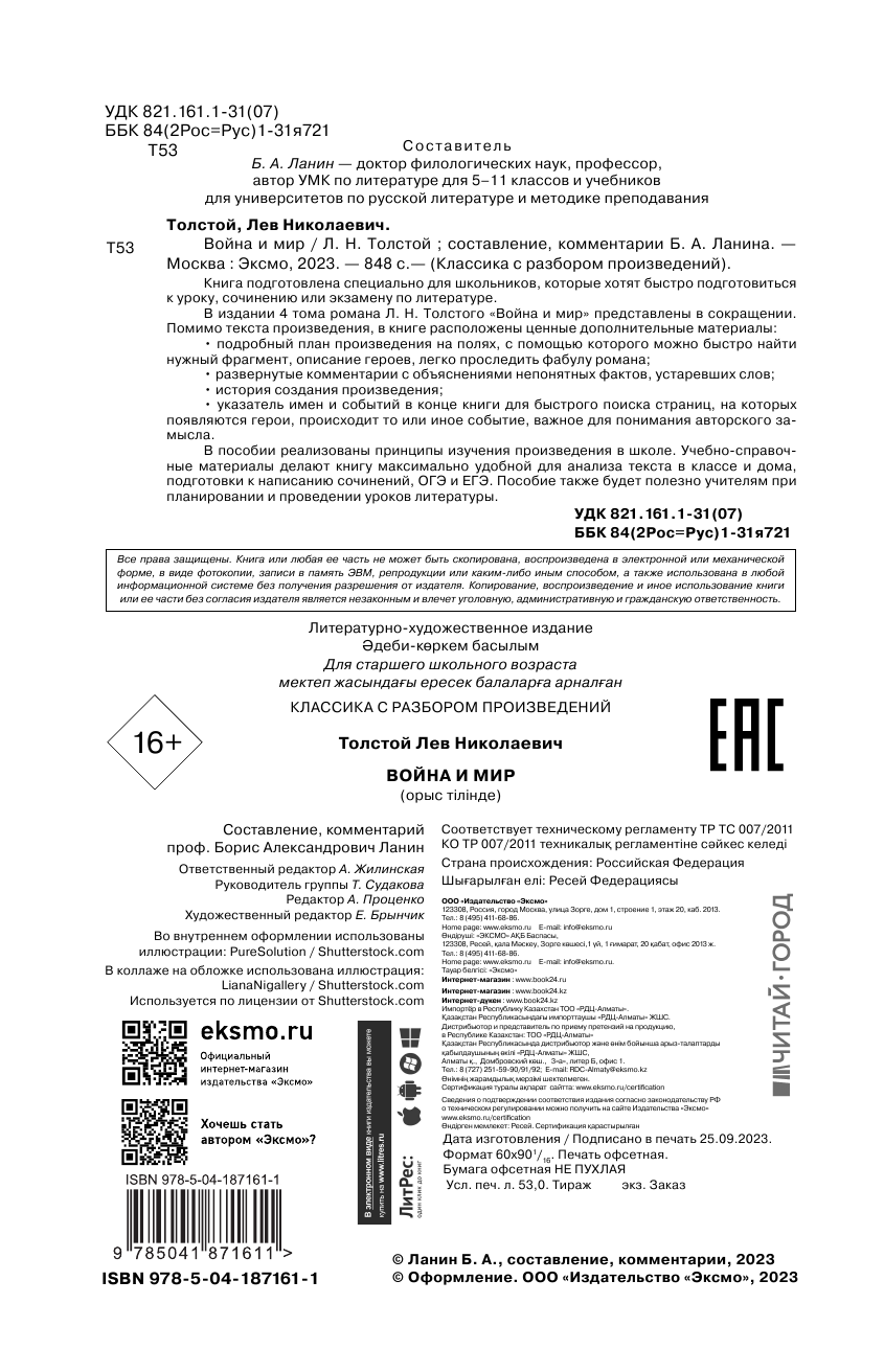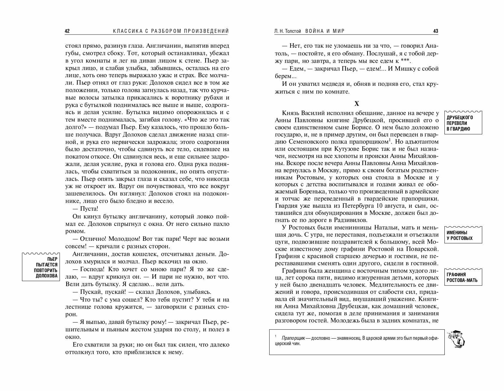 Все 4 тома грандиозной эпопеи приводятся в лаконичном сокращении, не упуская при этом ничего важного. Новое издание романа в невероятном оформлении с голографической фольгой на обложке станет не только незаменимым помощником в подготовке к ЕГЭ, ОГЭ, урокам литературы, но и приятным подарком для всех ценителей классической литературы. В нем вы найдете уникальные справочные материалы: заметки на полях для быстрого поиска нужного фрагмента, развернутые комментарии, где объясняются устаревшие слова и непонятные факты, историю создания произведения, указатель имен и событий. Все это поможет не только быстро и легко подготовиться к экзаменам, но и узнать новые факты, которые можно было упустить на уроке.