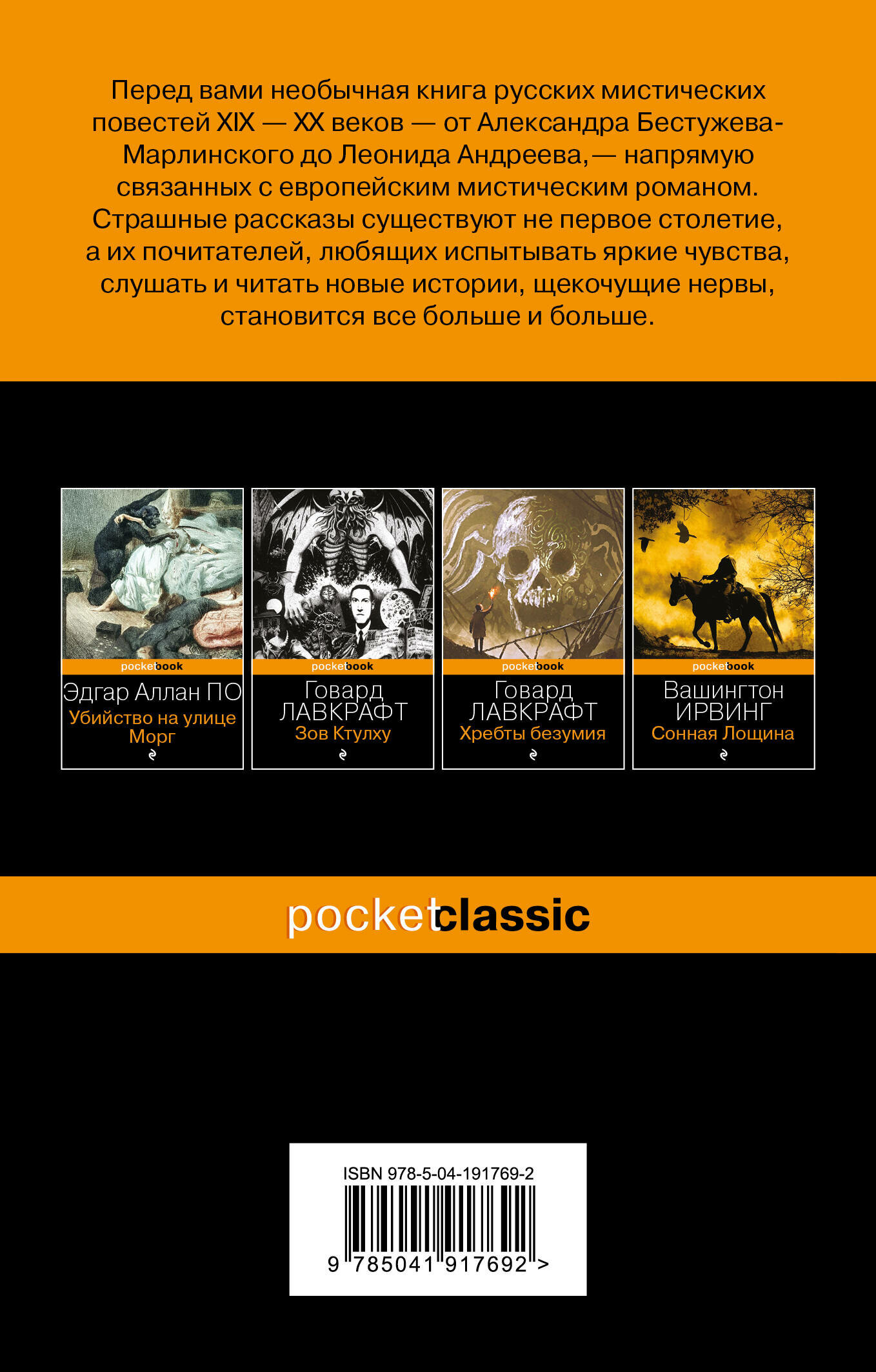 Перед вами необычная книга русских мистических повестей ХIХ—ХХ веков, от Александра Бестужева-Марлинского до Леонида Андреева, напрямую связанных с европейским мистическим романом. Страшные рассказы существуют не первое столетие, а их почитателей, любящих испытывать яркие чувства, слушать и читать новые истории, щекочущие нервы, становится все больше и больше.
