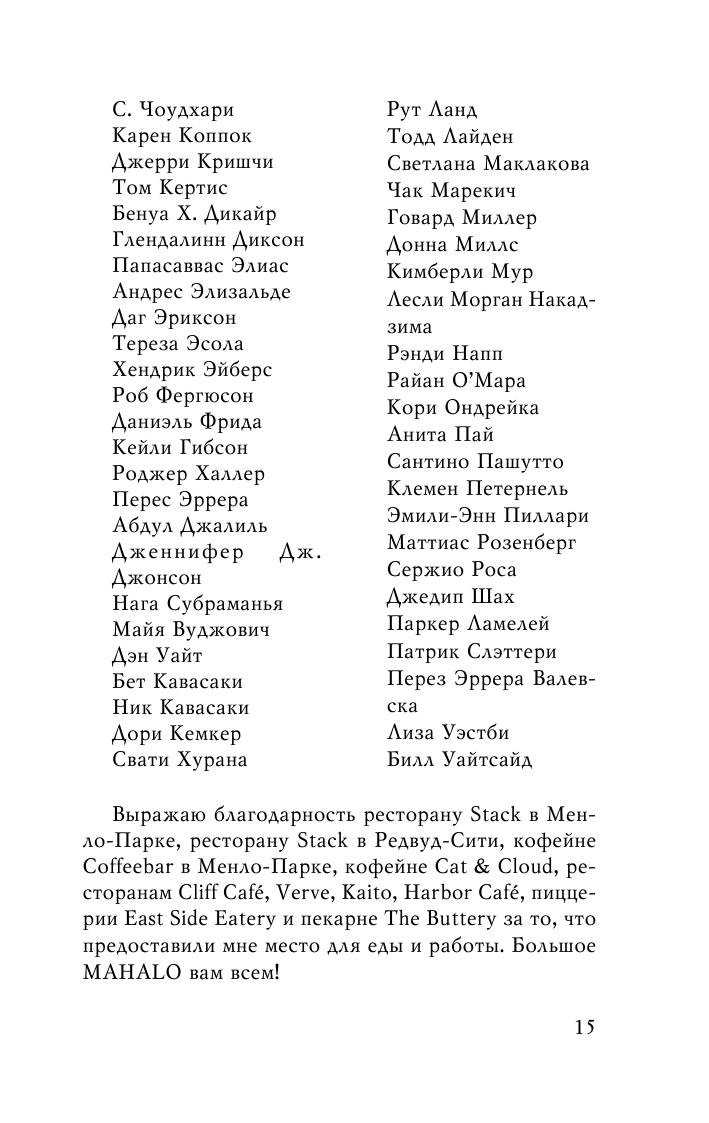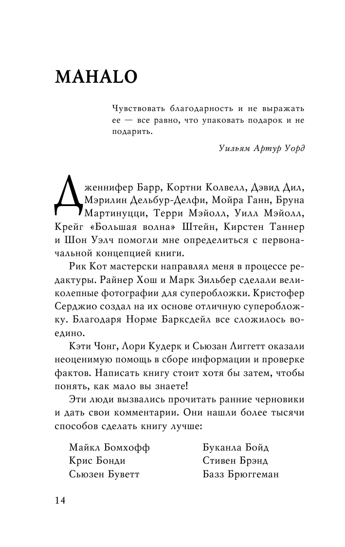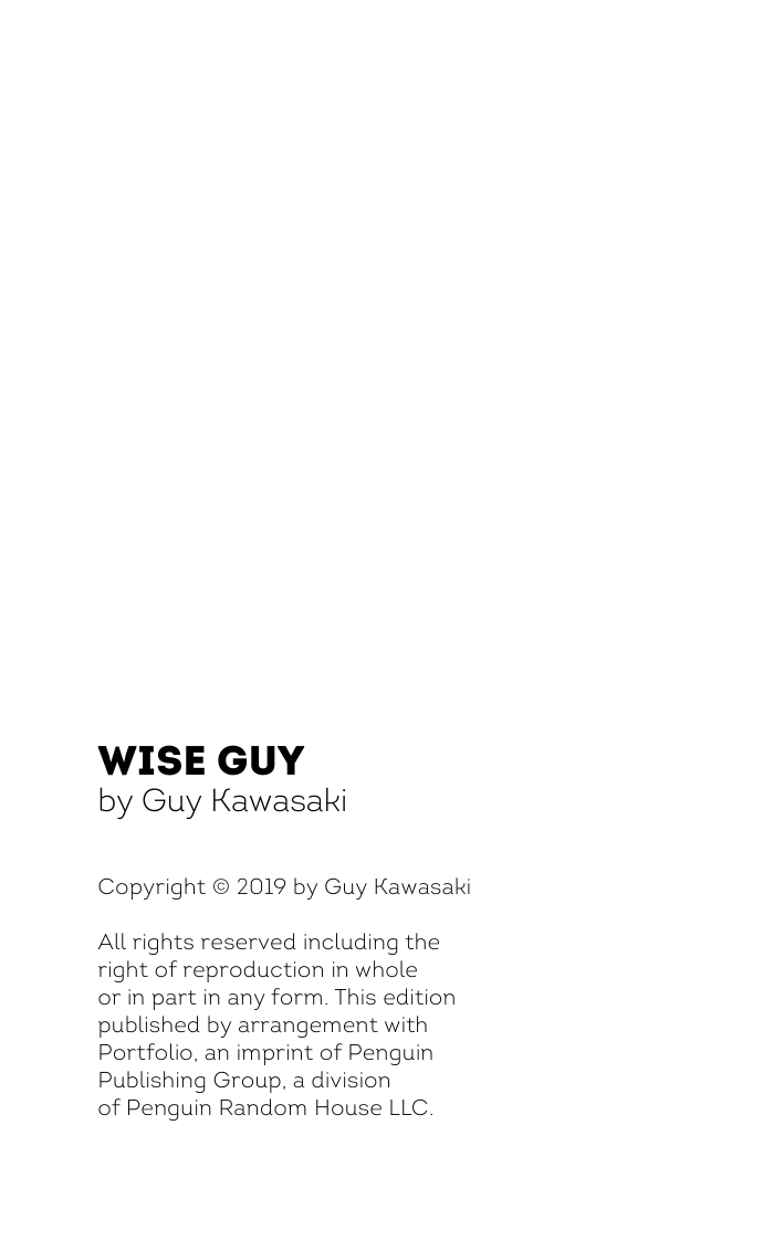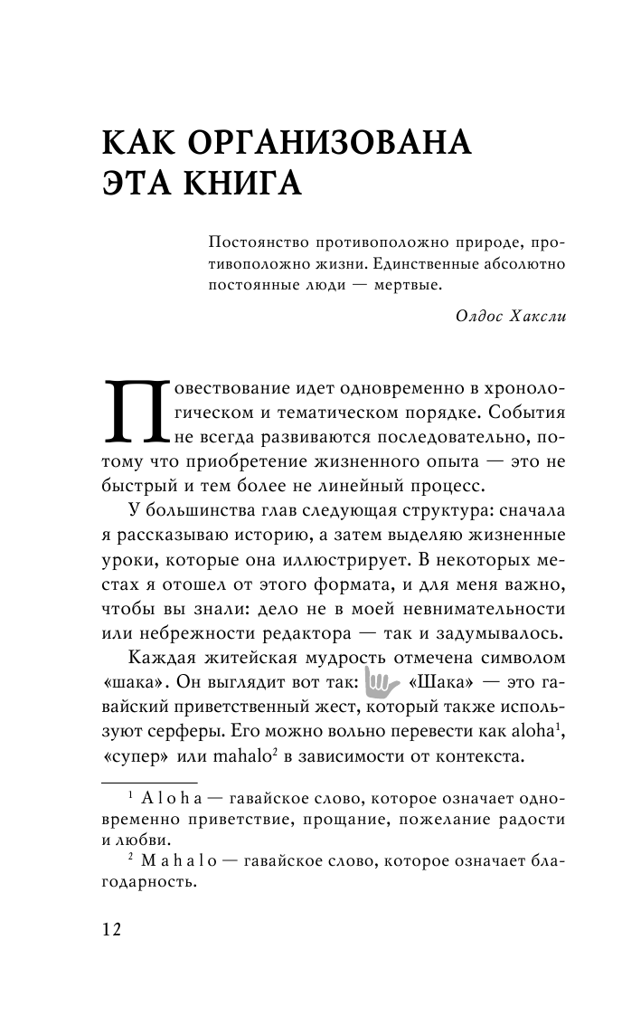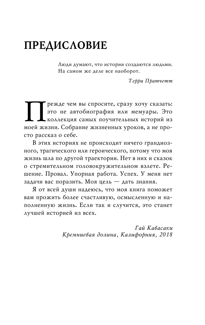 «Человек находит себя, всматриваясь в другого человека. Мне было очень интересно посмотреть на опыт Гая Кавасаки с точки зрения житейской мудрости — как он рефлексирует и анализирует свое прошлое. В этой книге он рассказывает, как сделать правильные выводы из прожитого опыта, которые помогут в становлении личности и формировании жизненных принципов, чтобы прожить цельную жизнь». — Максим Батырев, основатель Batyrev Consulting Group, автор бестселлеров «45 татуировок менеджера», «45 татуировок продавана» и «45 татуировок личности»