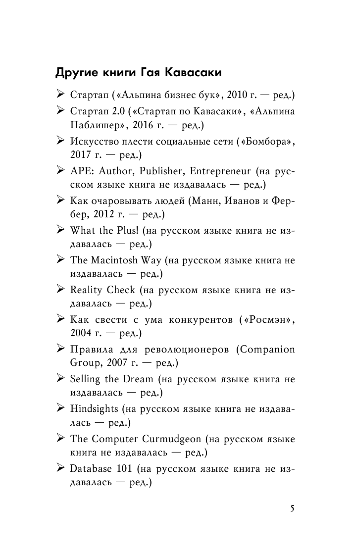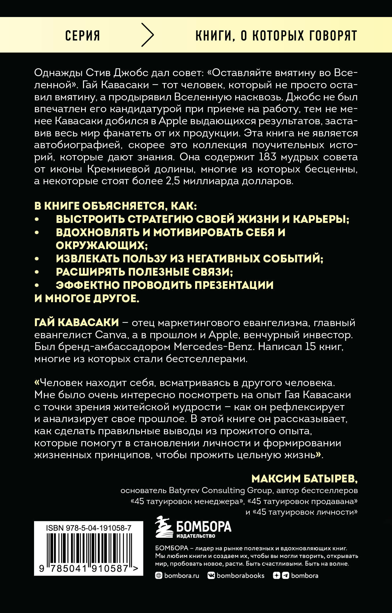 Однажды Стив Джобс дал совет: «Оставляйте вмятину во Вселенной». Гай Кавасаки тот человек, который не просто оставил вмятину, а продырявил Вселенную насквозь. Джобс не был впечатлен его кандидатурой при приеме на работу, тем не менее Кавасаки добился в Apple выдающихся результатов, заставив весь мир фанатеть от их продукции. Эта книга не является автобиографией, скорее это коллекция поучительных историй, которые дают знания. Она содержит 183 мудрых совета от иконы Кремниевой долины, многие из которых бесценны, а некоторые стоят более 2,5 миллиардов долларов.