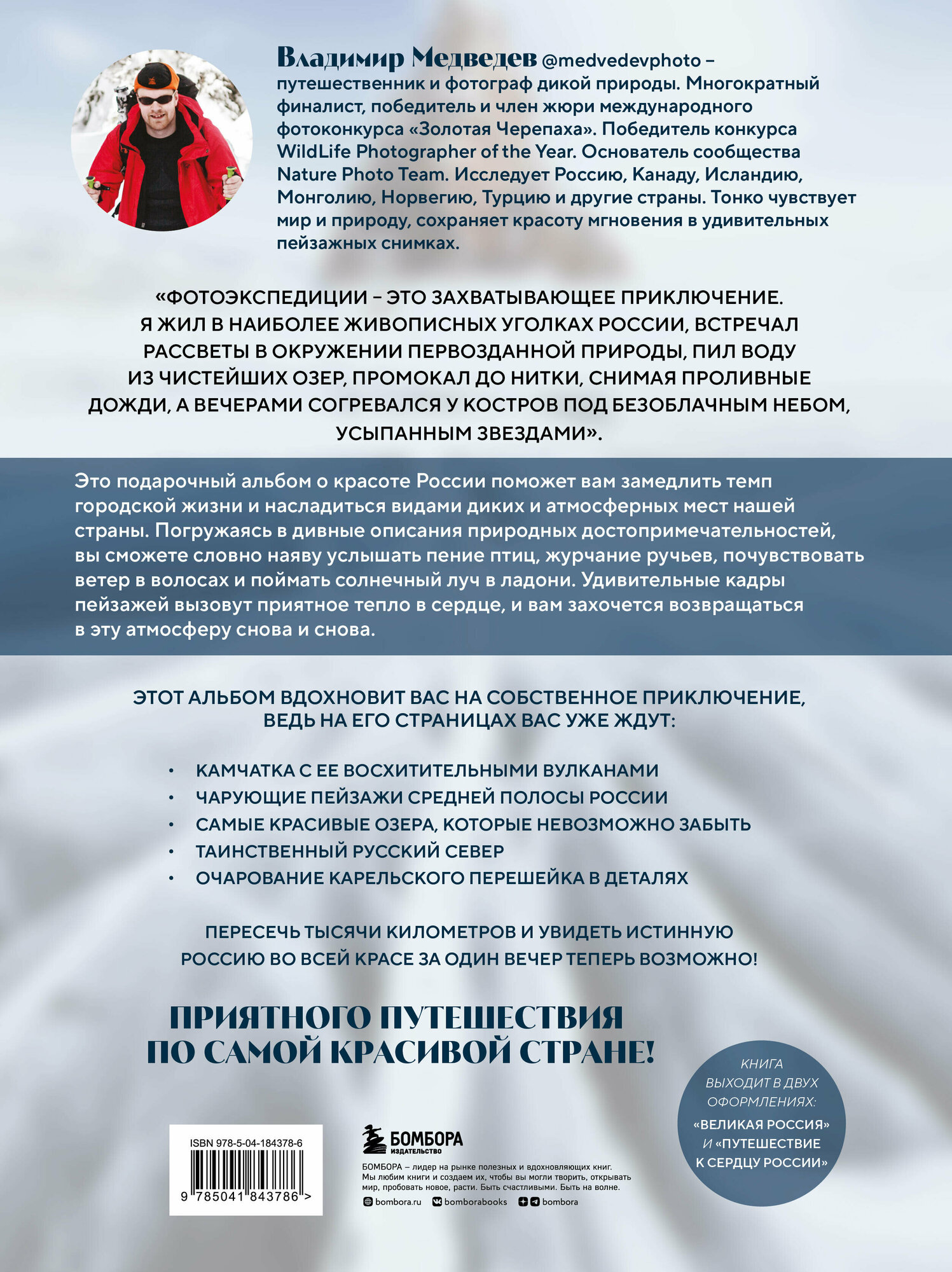 Любоваться пейзажами можно бесконечно, но еще более ценно, что вы узнаете и увидите то, что открывается лишь самым искушенным путешественникам. Вы станете больше, чем сторонним наблюдателем и читателем, вместе с впечатлениями и заметками Владимира Медведева вы погрузитесь в атмосферу каждой фотографии и каждого уголка нашей страны.