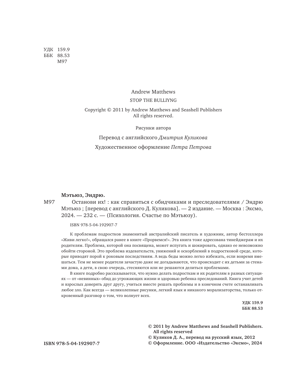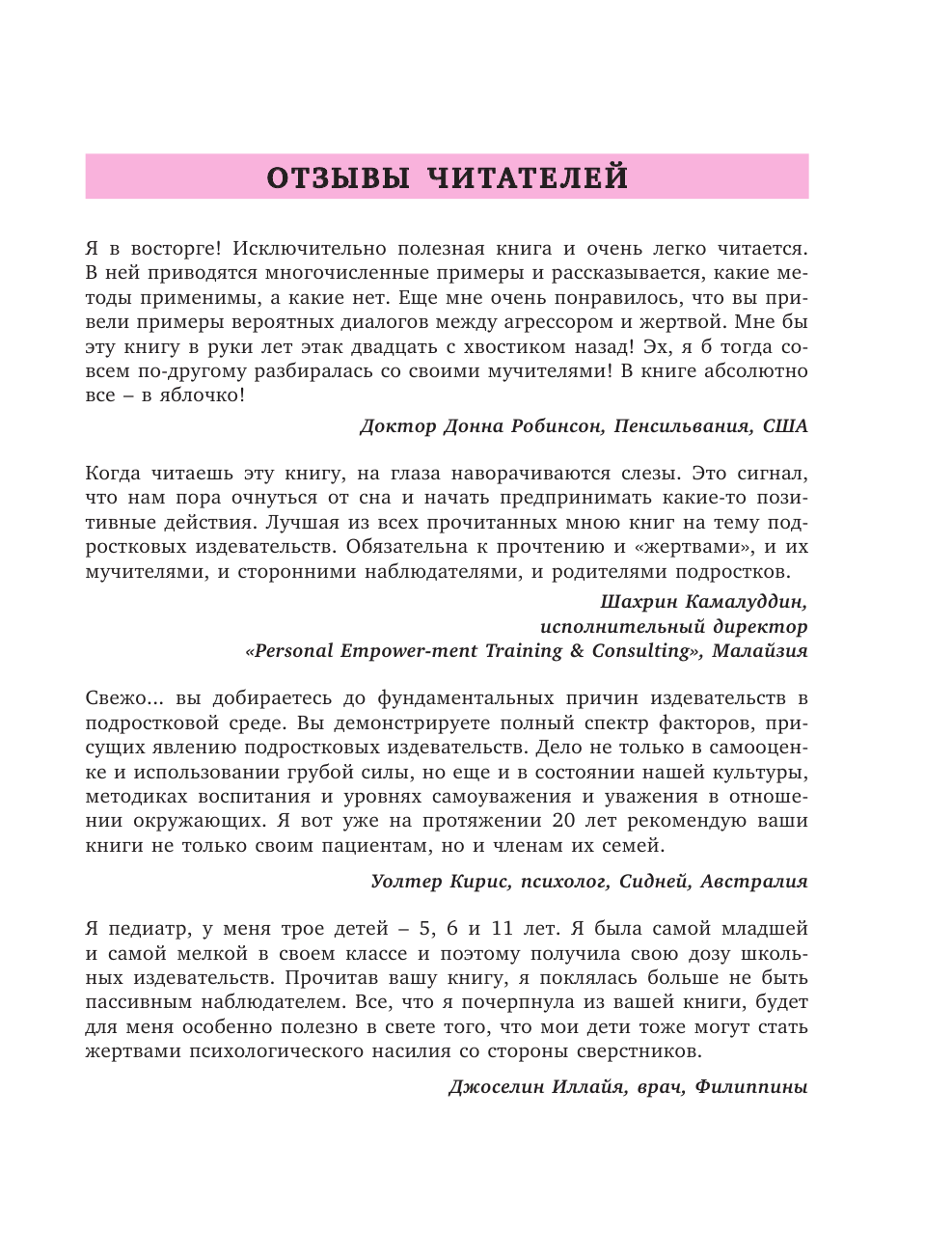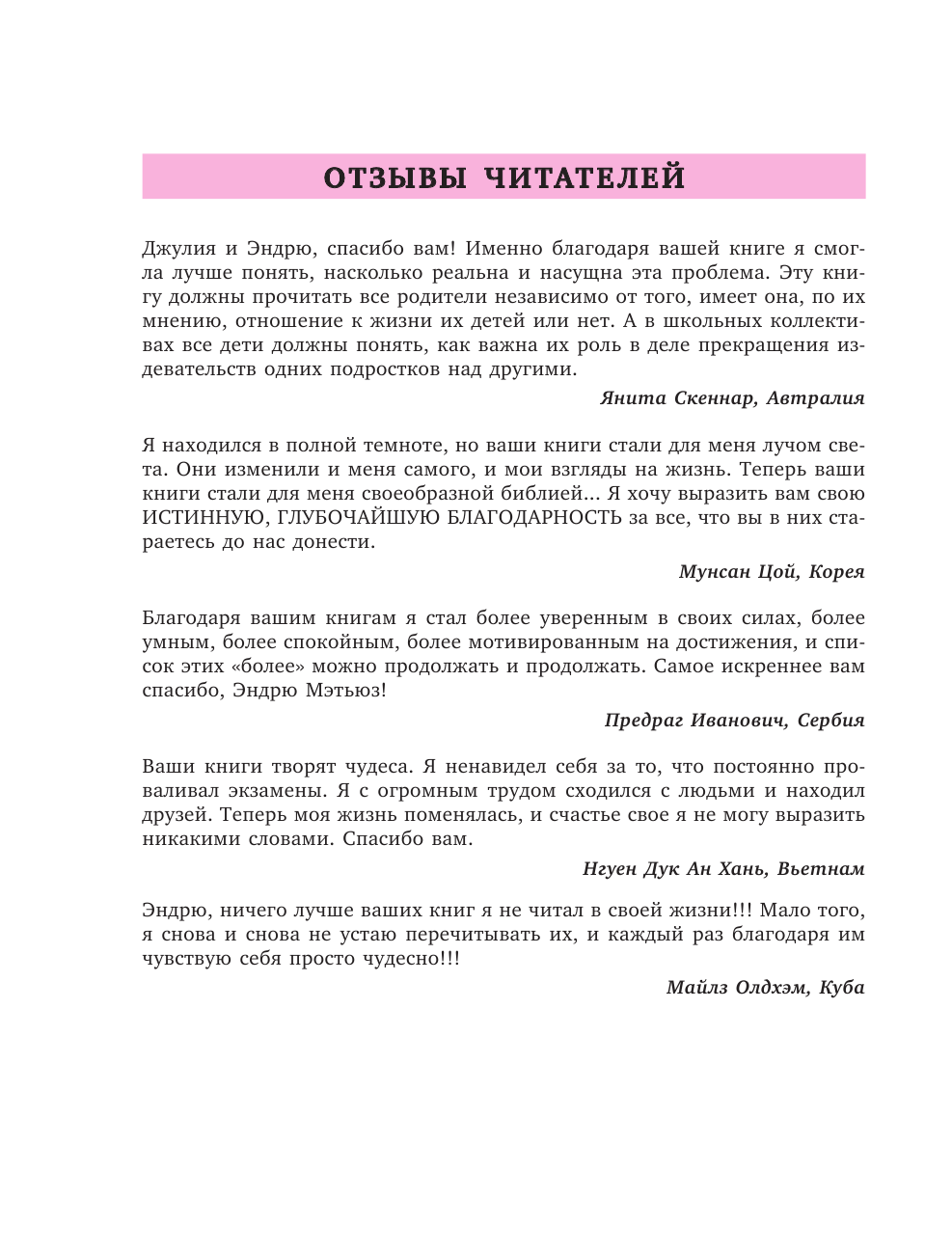 В книге подробно рассказывается, что нужно делать подросткам и их родителям в разных ситуациях – от "невинных" обид до угрожающих жизни и здоровью ребенка преследований. Книга учит детей и взрослых доверять друг другу, учиться вместе решать проблемы и, в конечном счете, останавливать любое зло. Как всегда – великолепные рисунки, легкий язык и никакого морализаторства, только