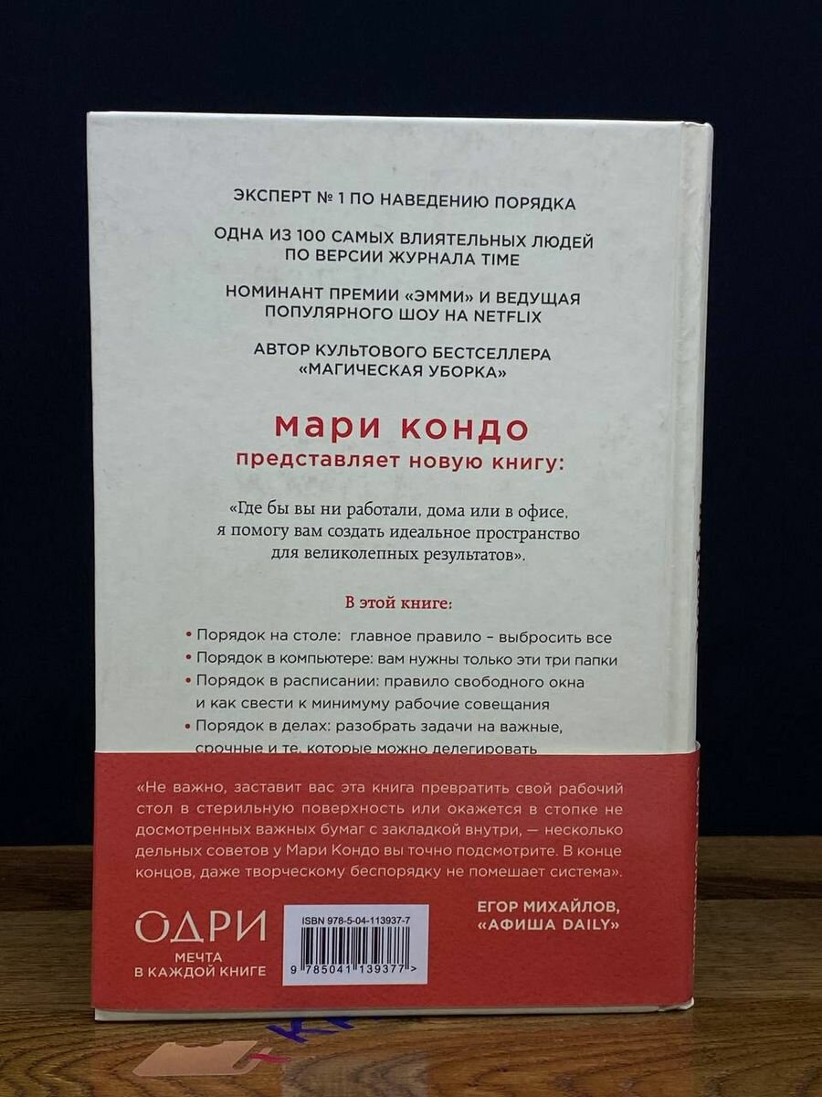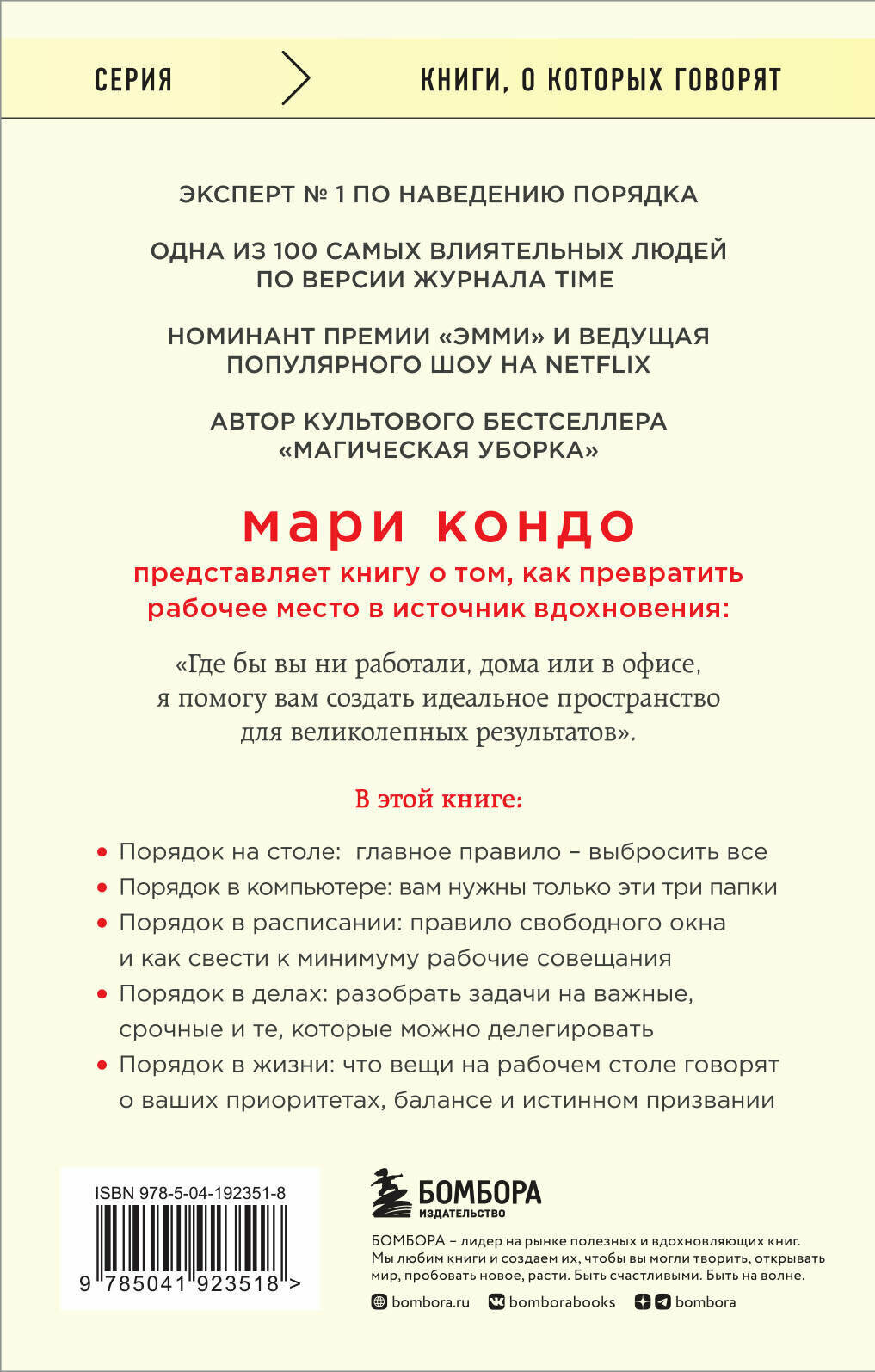 Первая книга Мари Кондо стала мировым бестселлером и помогла миллионам людей по всему миру разобрать завалы ненужного хлама и полюбить свои дома. Теперь она предлагает навести порядок на рабочем месте, где бы вы ни трудились: в офисе, дома или в мастерской. Ведь когда нам комфортно, светло и уютно, мы больше успеваем и меньше устаем.