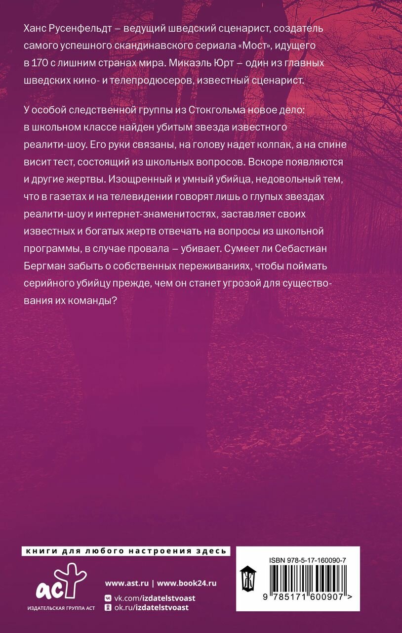 У особой следственной группы из Стокгольма новое дело: в школьном классе найден убитым звезда известного реалити-шоу. Его руки связаны, на голову надет колпак, а на спине висит тест, состоящий из школьных вопросов. Вскоре появляются и другие жертвы. Изощренный и умный убийца, недовольный тем, что в газетах и на телевидении говорят лишь о глупых звездах реалити-шоу и интернет-знаменитостях, заставляет своих известных и богатых жертв отвечать на вопросы из школьной программы, в случае провала – убивает. Сумеет ли Себастиан Бергман забыть о собственных переживаниях, чтобы поймать серийного убийцу прежде, чем он станет угрозой для существования их команды?