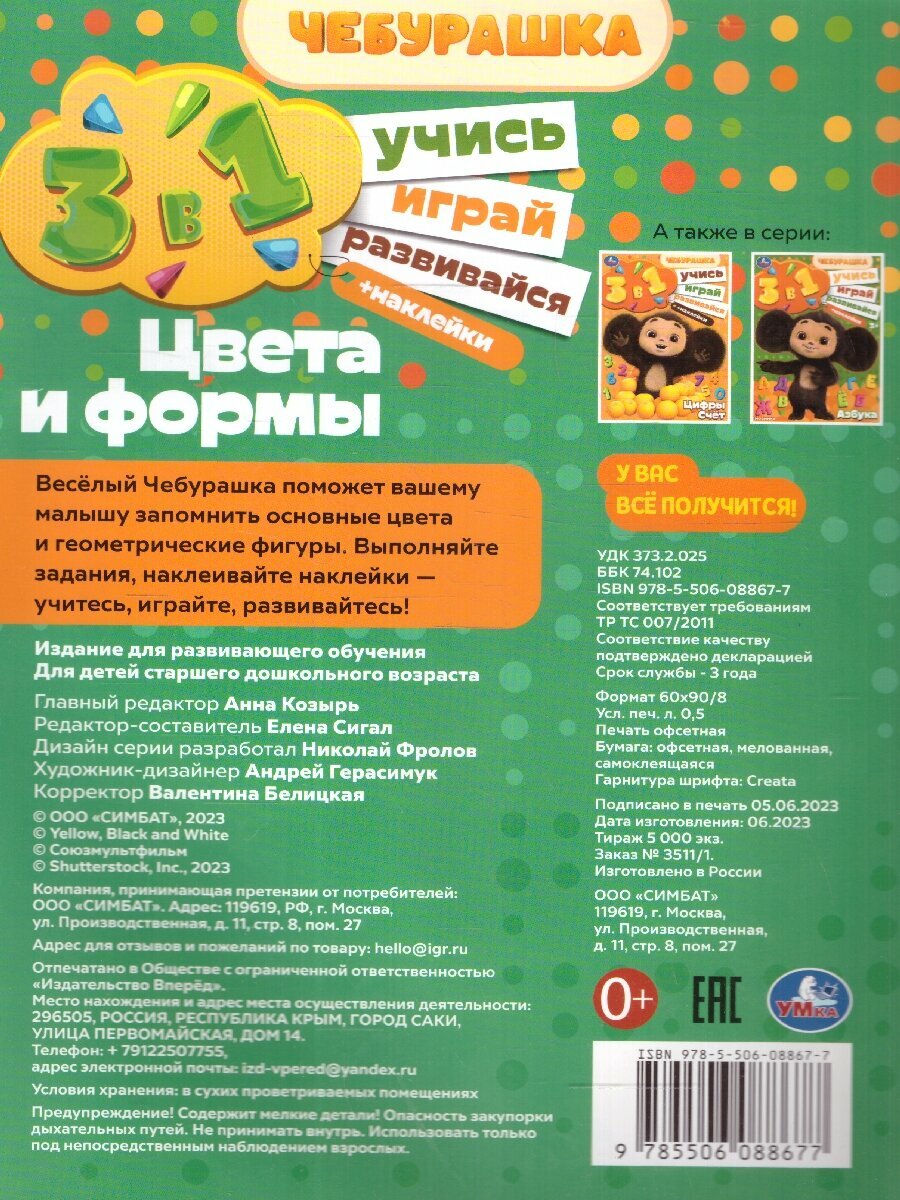 Активити 3 в 1 с наклейками. Учись! Играй! Развивайся! Чебурашка. Цвета и формы (Сигал Елена (редактор)); Умка, 2023