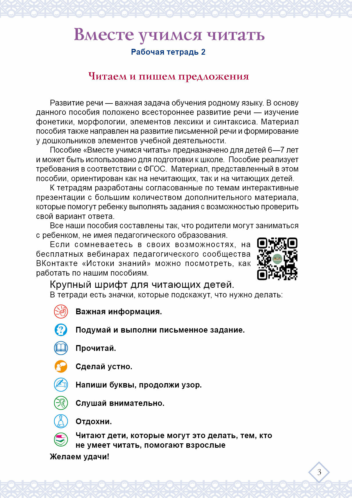 Пособие «Вместе учимся читать» состоит из трёх тетрадей («Учим буквы», «Читаем слоги и слова», «Читаем и пишем предложения») и предназначено для правильного эффективного обучения слоговому чтению и подготовки к школе детей от 4-х лет.