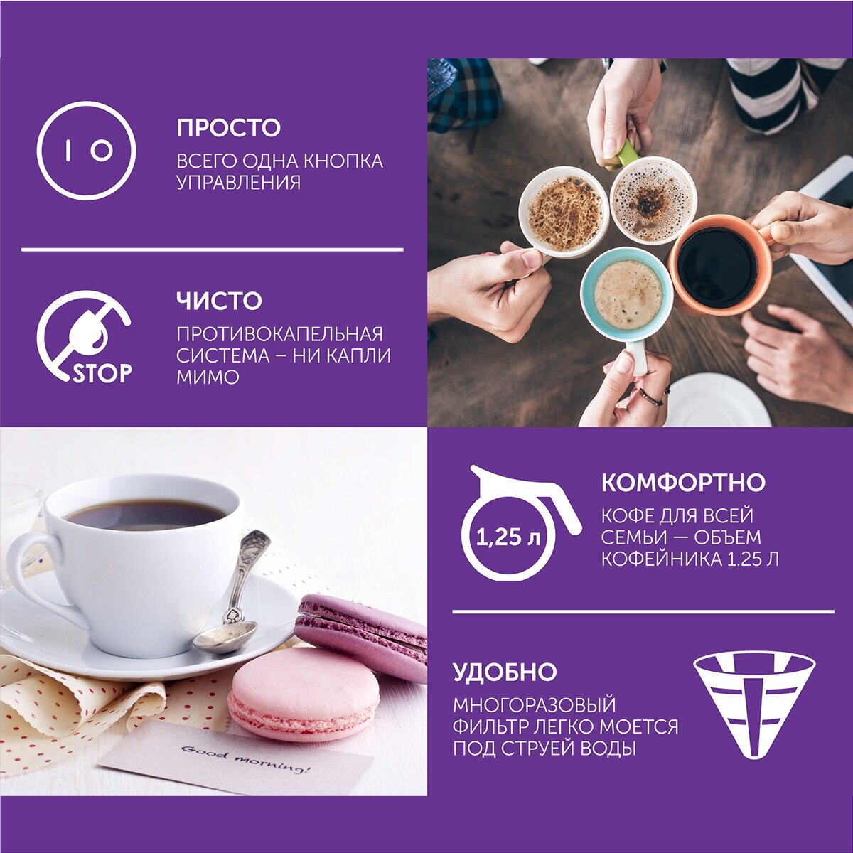 | Дополнительно | съемный многоразовый фильтр, объем кофейника 1.25 л, длина шнура питания 1 м |