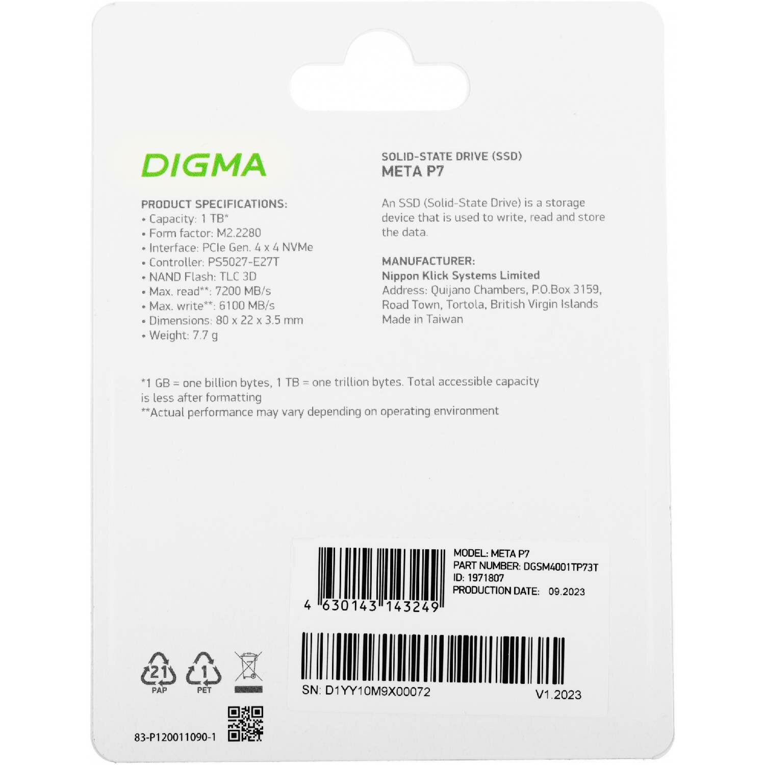 Модель: PCIe 4.0 x4 Meta P7 1TB (DGSM4001TP73T)