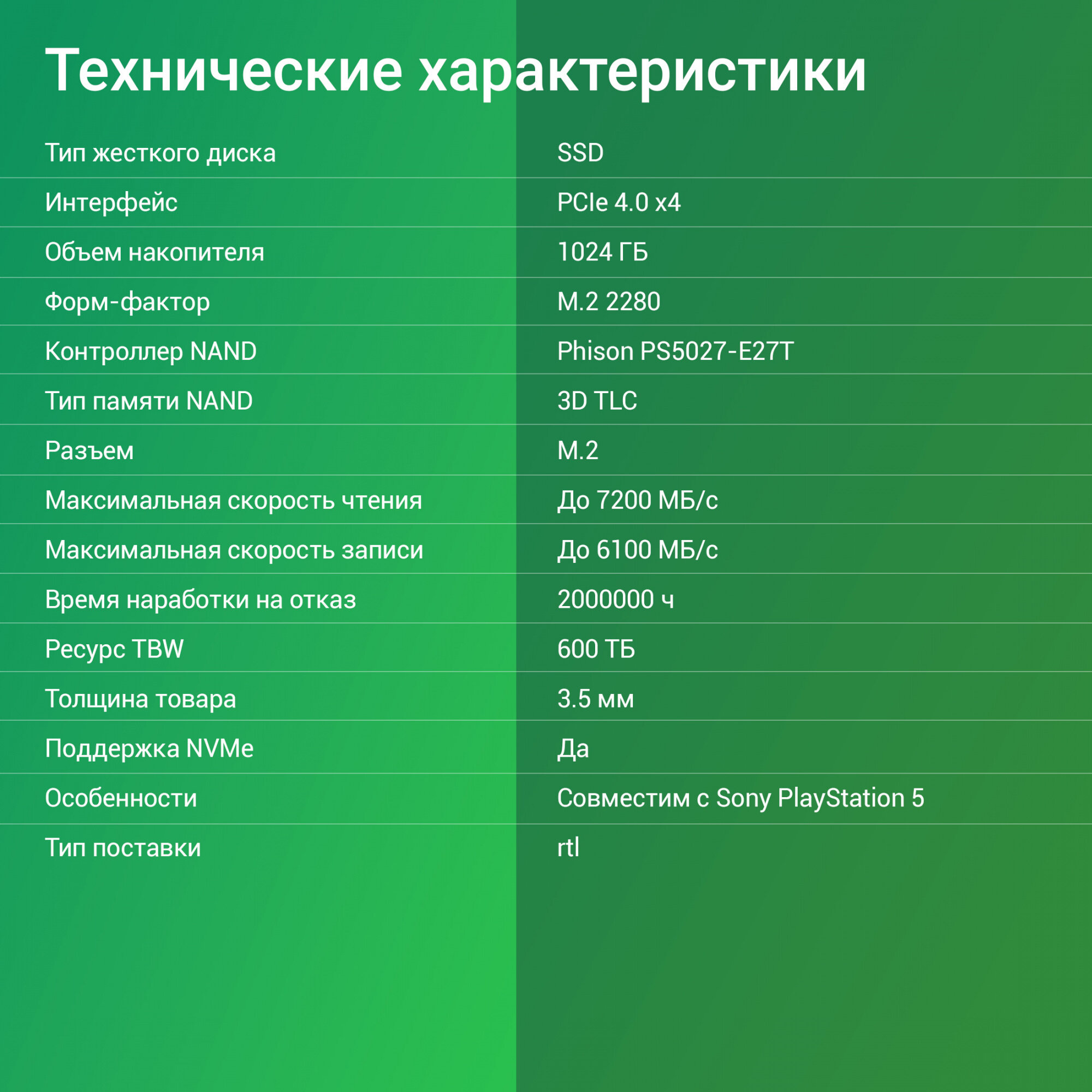 | Объем | 1024 ГБ; интерфейс:PCIe 4.0 x4 |
