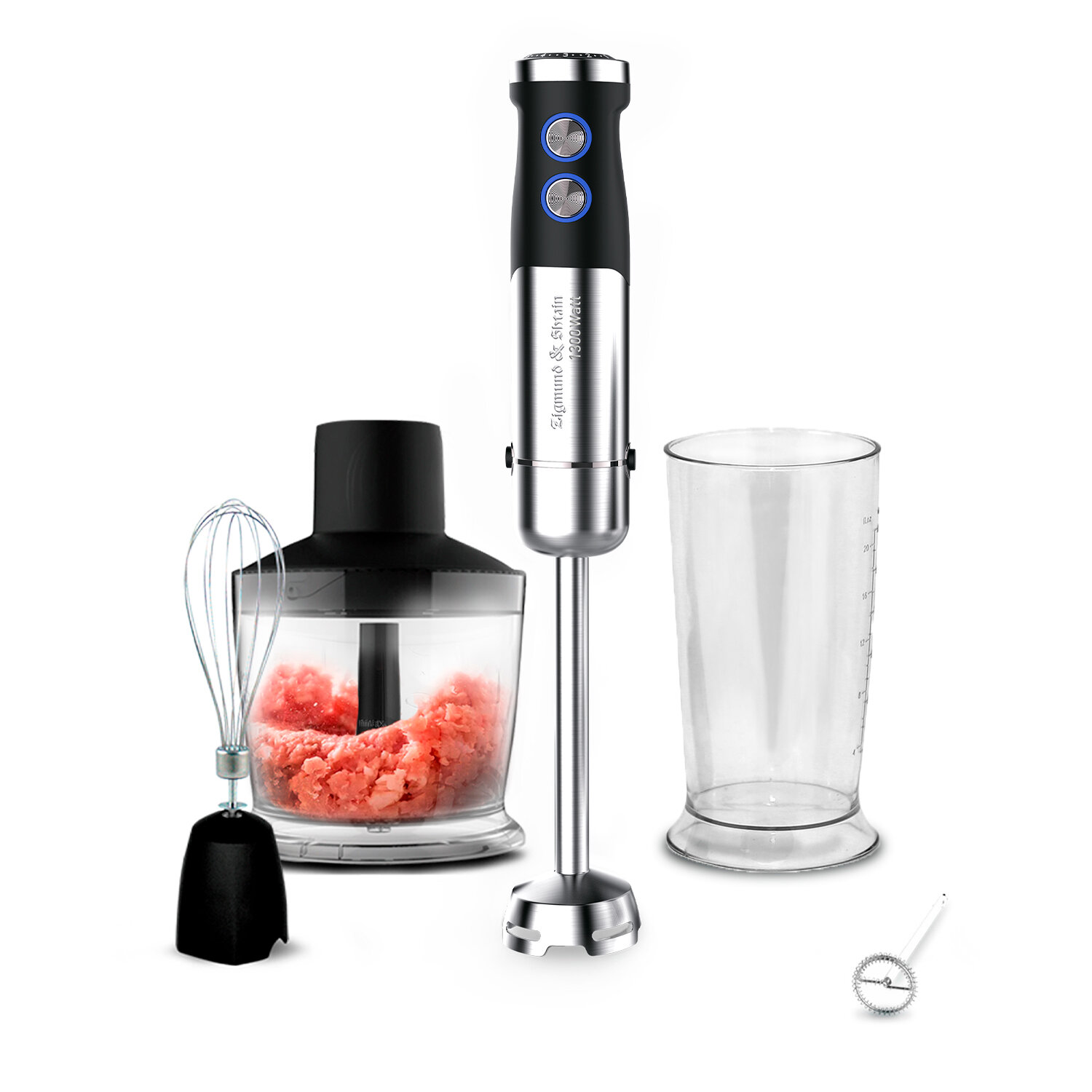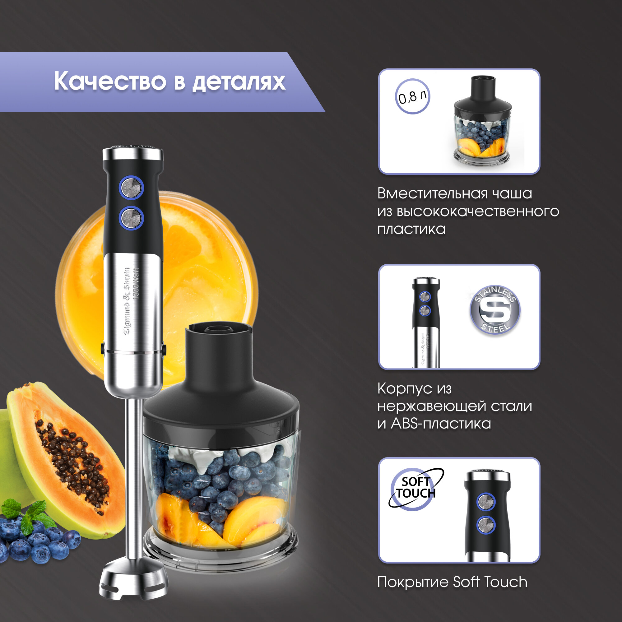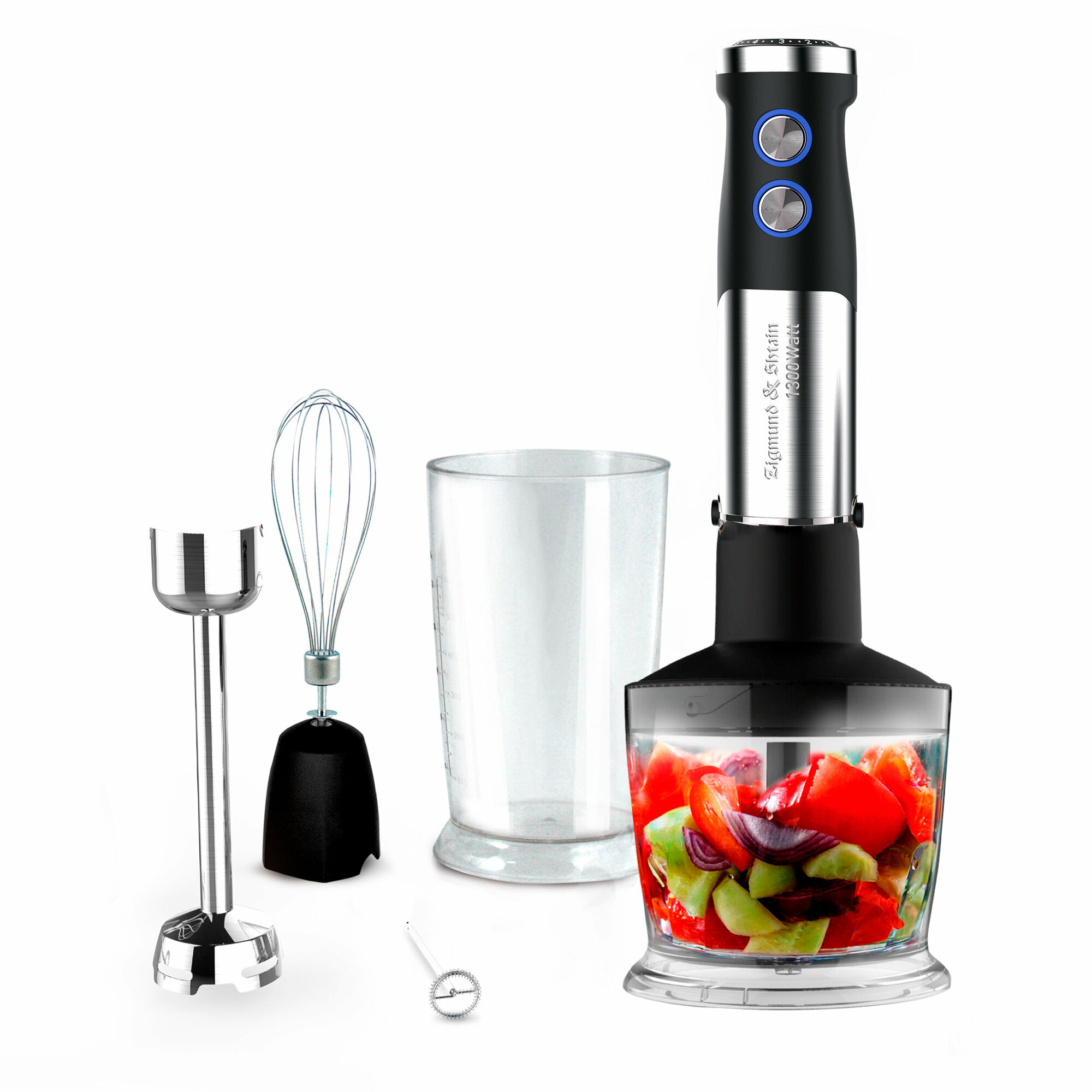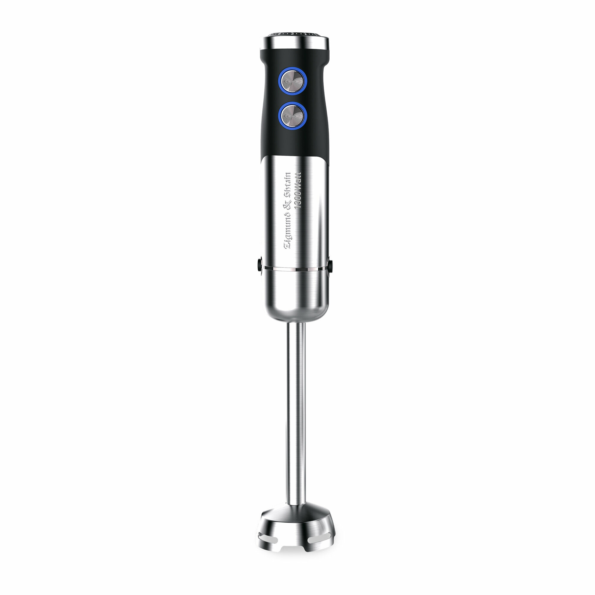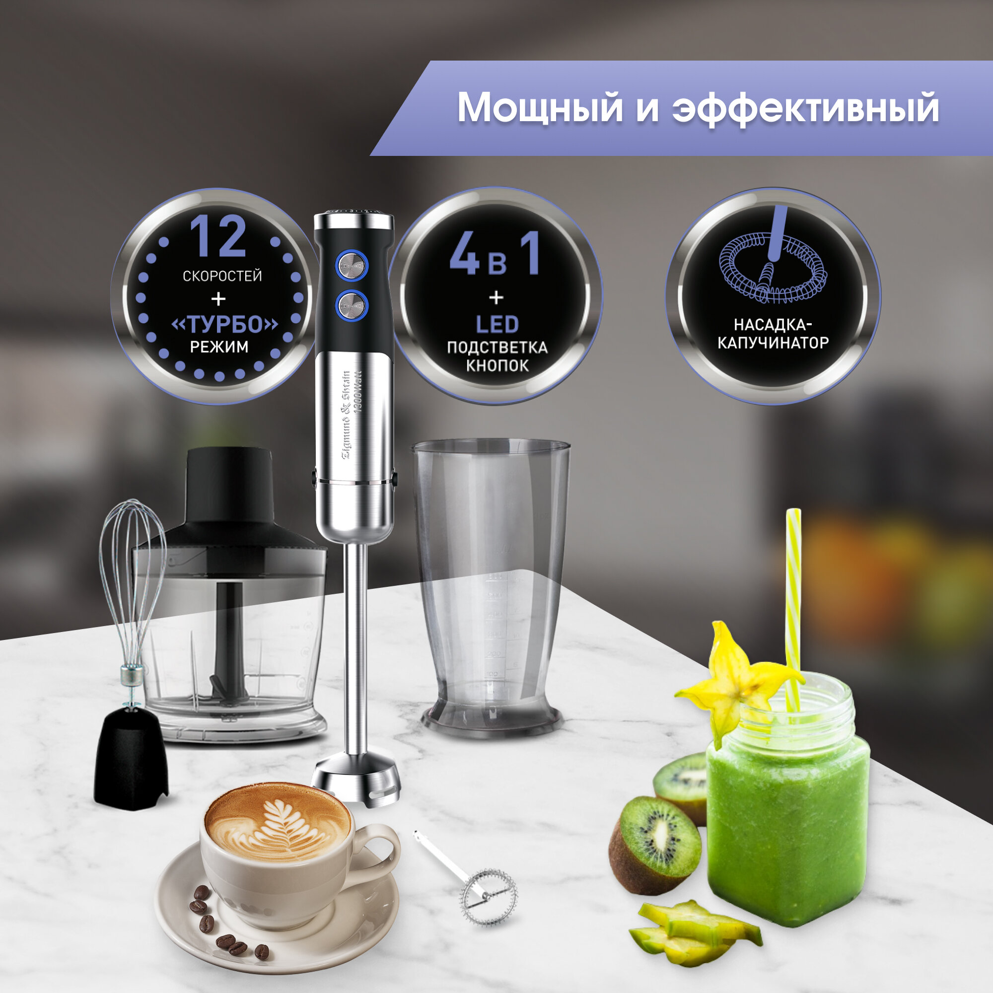 Погружной блендер от компании Zigmund & Shtain – это многофункциональный кухонный прибор, призванный значительно облегчить домашний труд и жизнь любой хозяйки. Он заменяет на кухне сразу несколько самых необходимых приборов, таких как измельчитель, миксер и мясорубку, а значит сильно экономит время и место для хранения.В комплекте идут съемная насадка-блендер, нож-измельчитель, венчик и насадка-капучинатор, которые быстро и качественно измельчают, взбивают и смешивают любые продукты. Благодаря высокой мощности и наличию 12 скоростей и Турборежиму, обработка продуктов и доведение их до желаемой консистенции занимает считанные секунды.Погружной блендер – современный, стильный, компактный и удобный помощник на кухне. Zigmund & Shtain – готовьте быстро и с удовольствием!· Высокая мощность 1300 Вт – гарантия высокого качества и скорости обработки продуктов· 12 скоростей с плавной регулировкой/Прецизионный переключатель скоростей· Режим Турбо для наиболее быстрой и интенсивной обработки продуктов· Скорость вращения двигателя: 10000-16000 об/мин· DC-мотор с пониженным уровнем шума· Насадка-блендер Easy Blend из нержавеющей стали· Расширенная комплектация: насадка-блендер, насадка-венчик, насадка-измельчитель, насадка-капучинатор, чаша для измельчения и стакан для смешивания· Кнопочная система крепления насадок· Светодиодная подсветка кнопок· Антискользящие вставки на днище чаши для дополнительной устойчивости