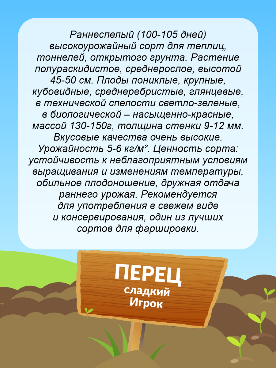 Раннеспелый (100-105 дней) высокоурожайный сорт для теплиц, тоннелей, открытого грунта. Растение полураскидистое, среднерослое, высотой 45-50 см. Плоды пониклые, крупные, кубовидные, среднеребристые, глянцевые, в технической спелости светло-зеленые, в биологической - насыщенно-красные, массой 130-150 г, толщина стенки 9-12 мм. Вкусовые качества очень высокие. Урожайность 5-6 кг/м. кв. Ценность сорта: устойчивость к неблагоприятным условиям выращивания и изменениям температуры, обильное плодоношение, дружная отдача раннего урожая. Рекомендуется для употребления в свежем виде и консервирования, один из лучших сортов для фаршировки.