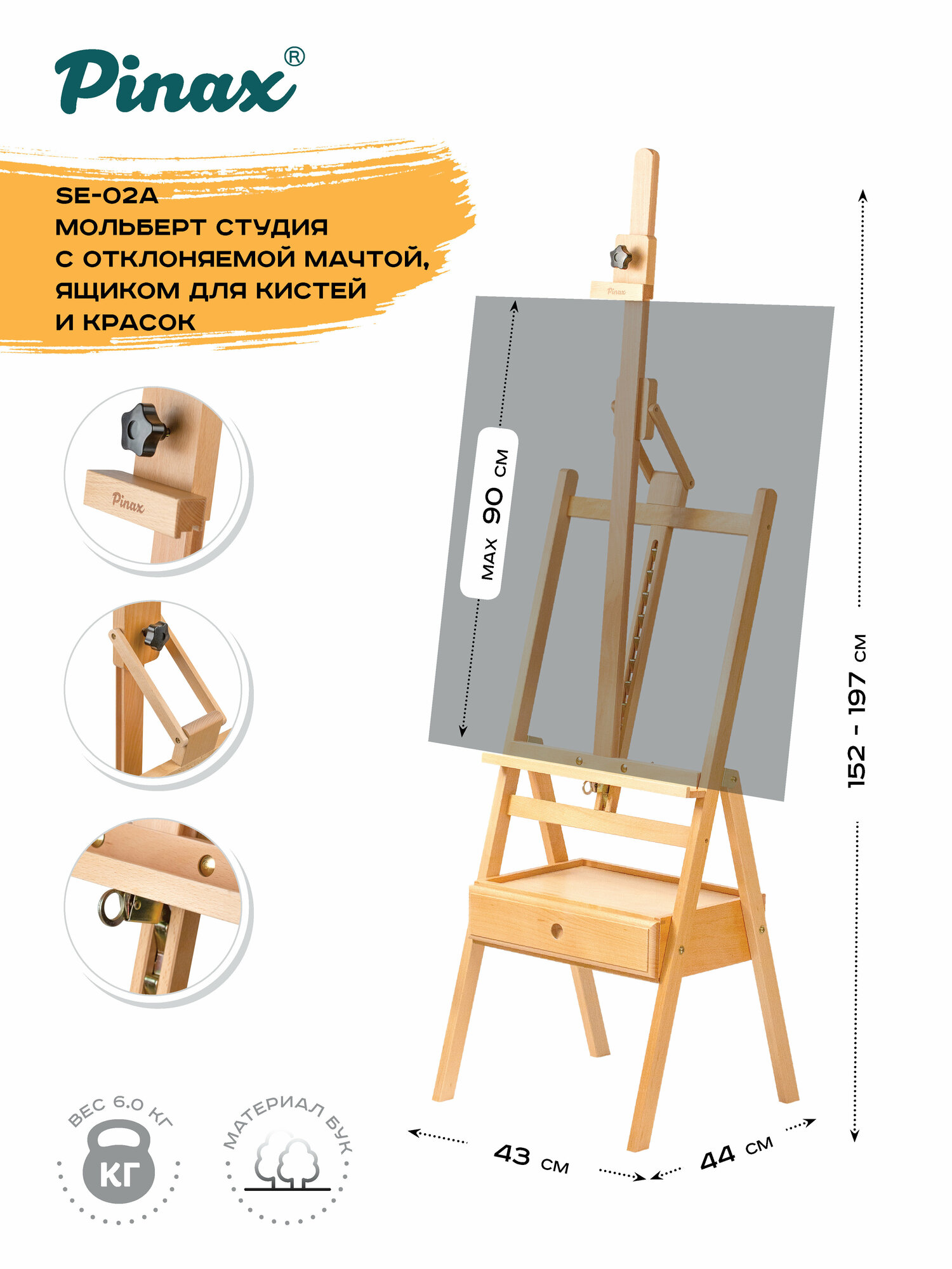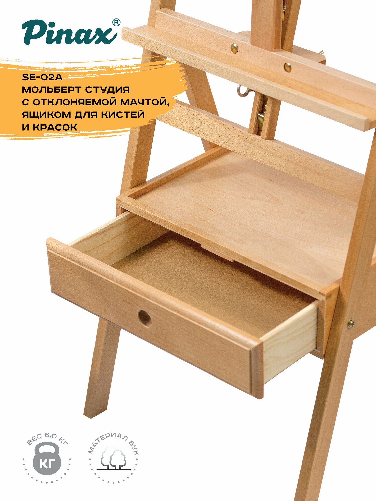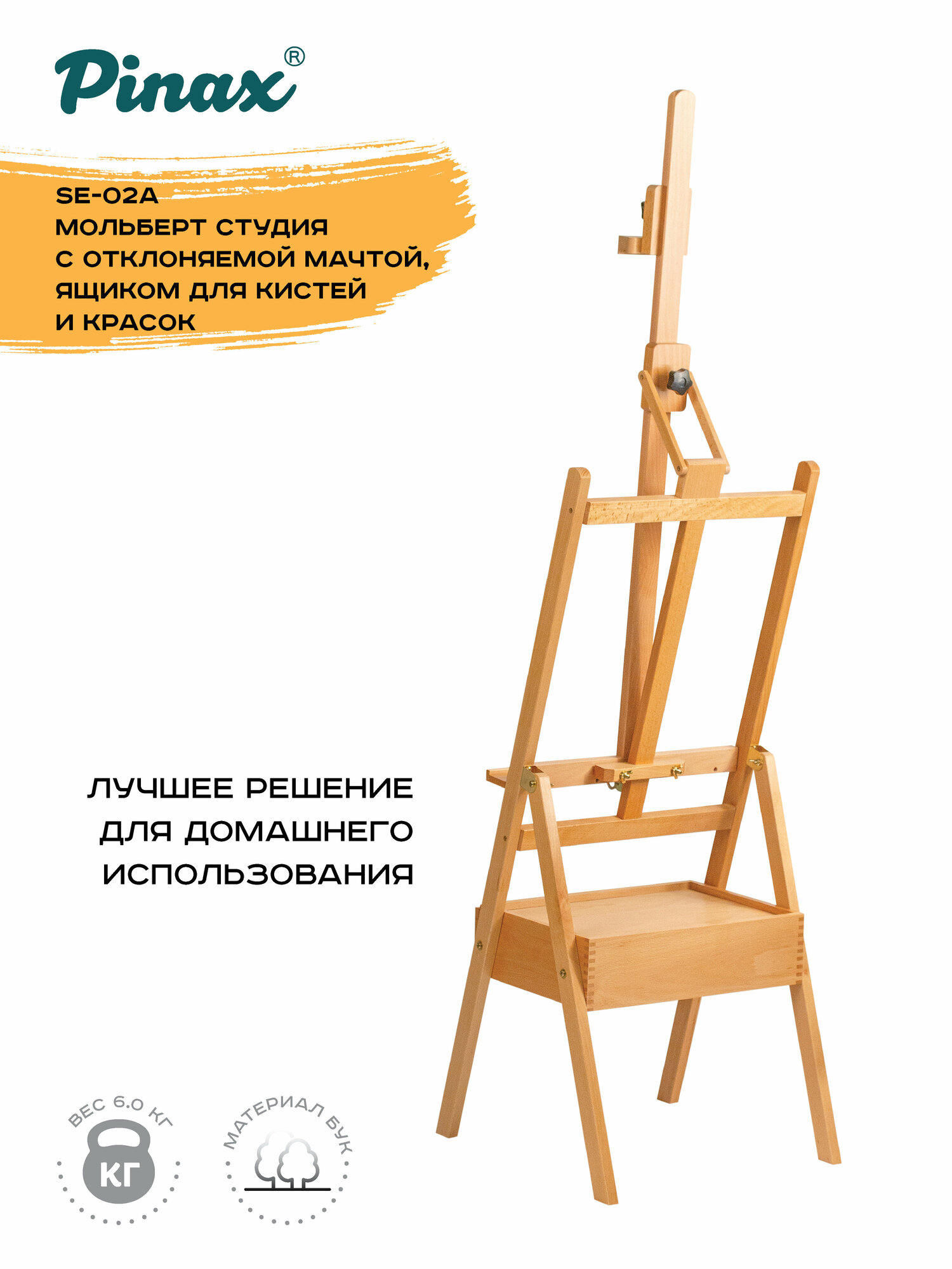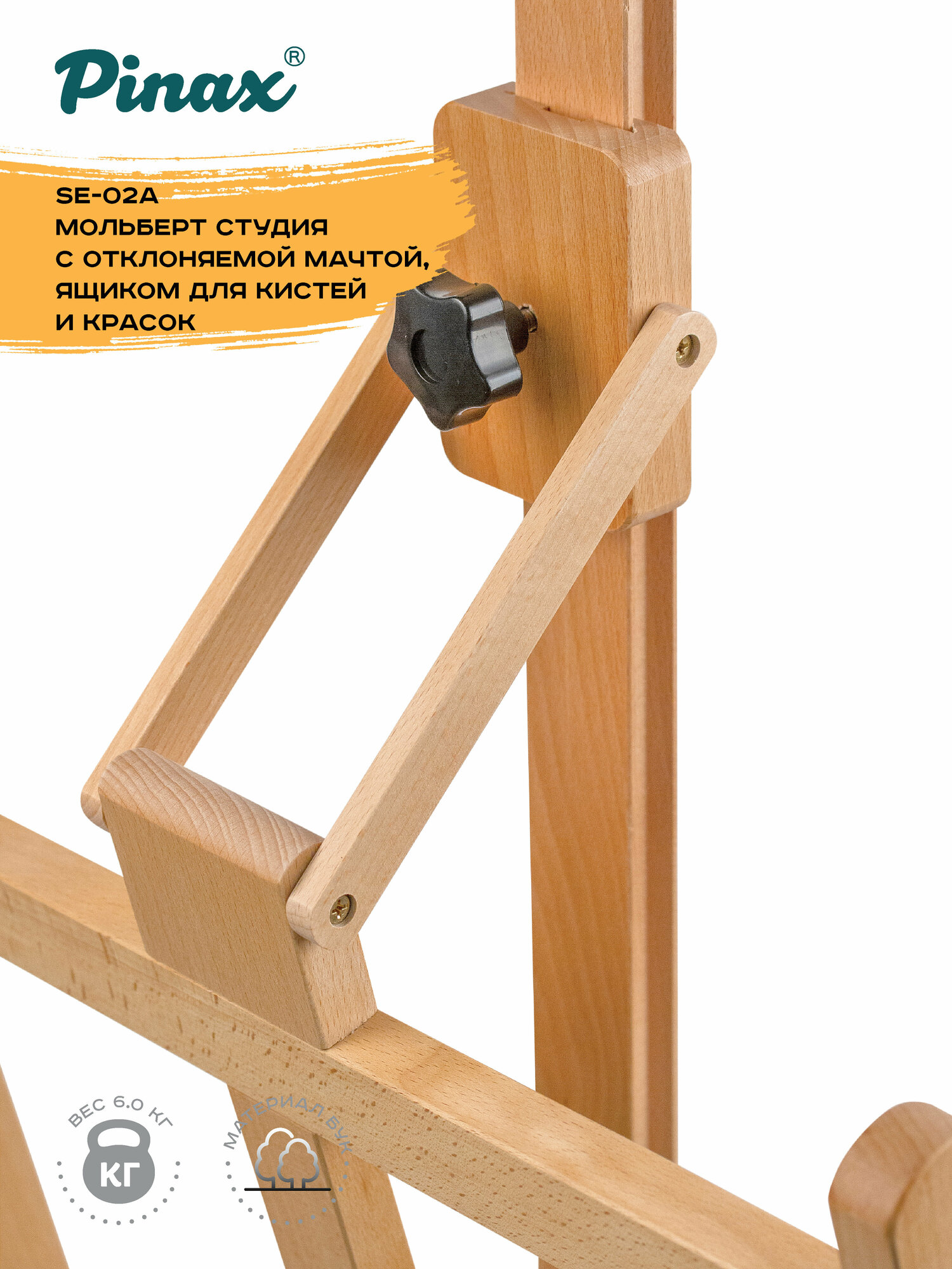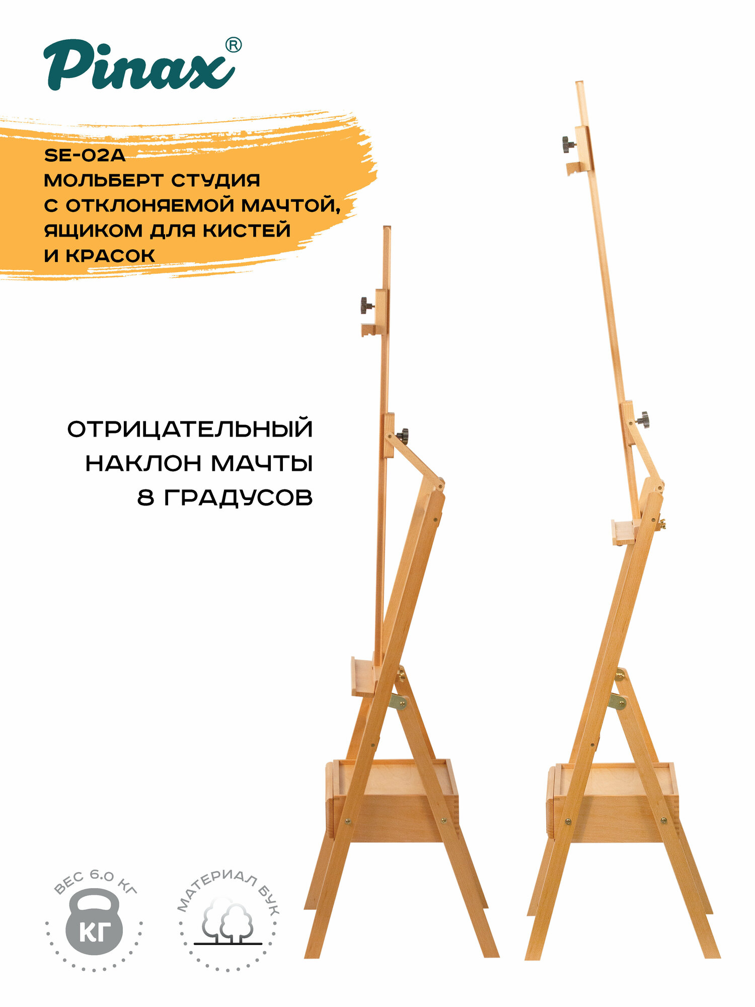 Самая продвинутая модификация в семействе компактных студийных мольбертов Pinax дополнительно оборудована мачтой с изменяемым углом наклона. Конструкция позволяет отклонить мачту в направлении художника на 8 градусов, это может быть необходимо как для комфортной работы (например, для защиты от бликов), так и для защиты художественного полотна от оседания пыли в перерывах между работой. Мольберт изготовлен из европейского бука — прочного и долговечного материала, покрыт слоем защитного лака и легко очищается от краски.