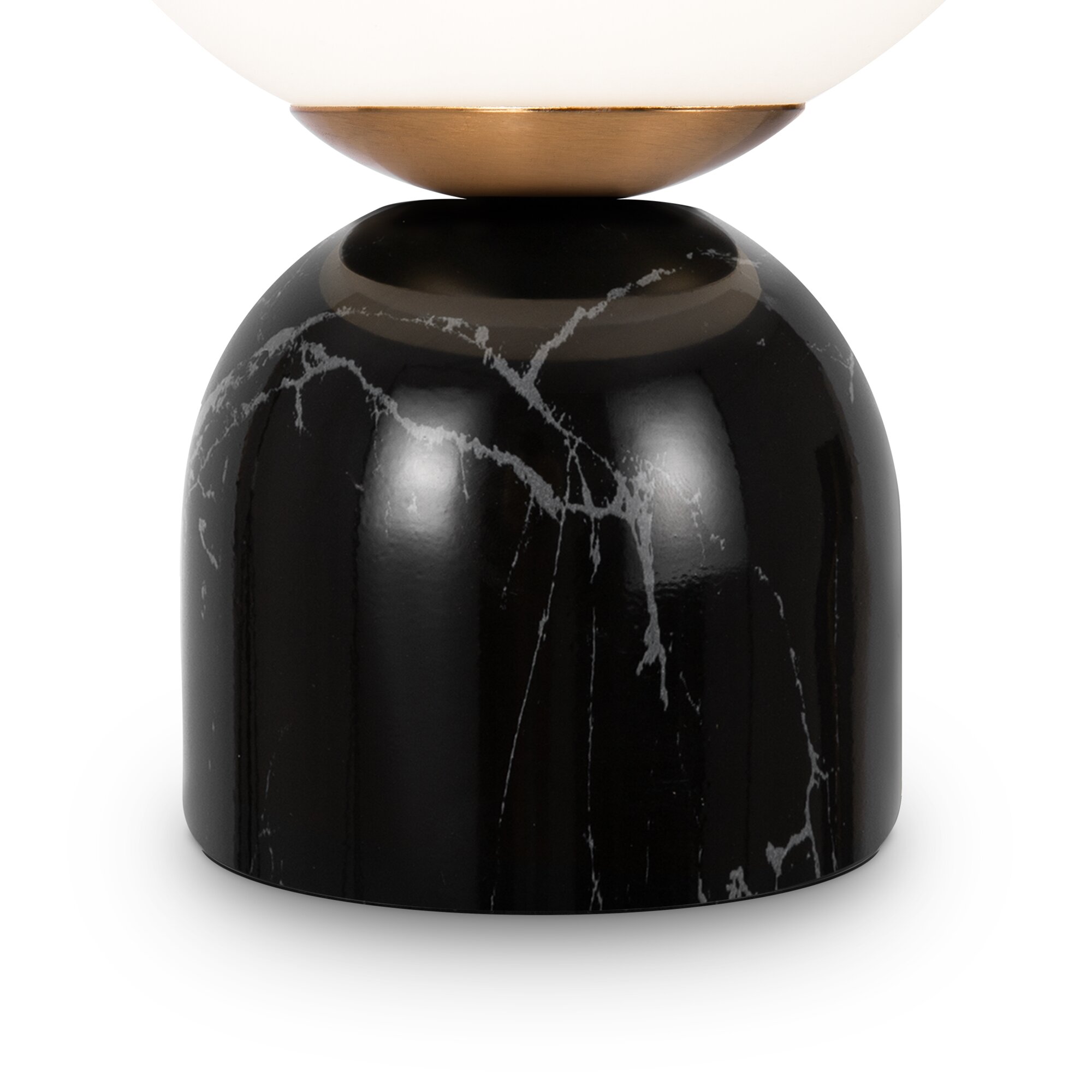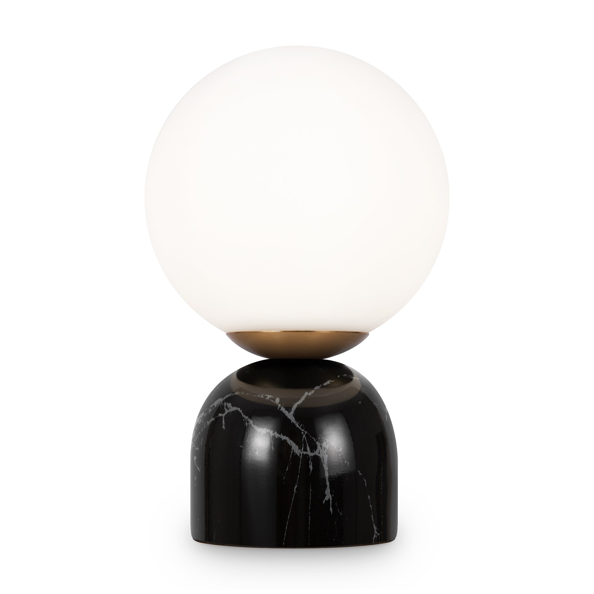 Материал основания — натуральный мрамор с уникальным рисунком. Цвета — белый, черный. Обтекаемая форма и неповторимый природный рисунок придадут вашему интерьеру уникальность. Шаровидный плафон. Источник света — лампа с цоколем E14.