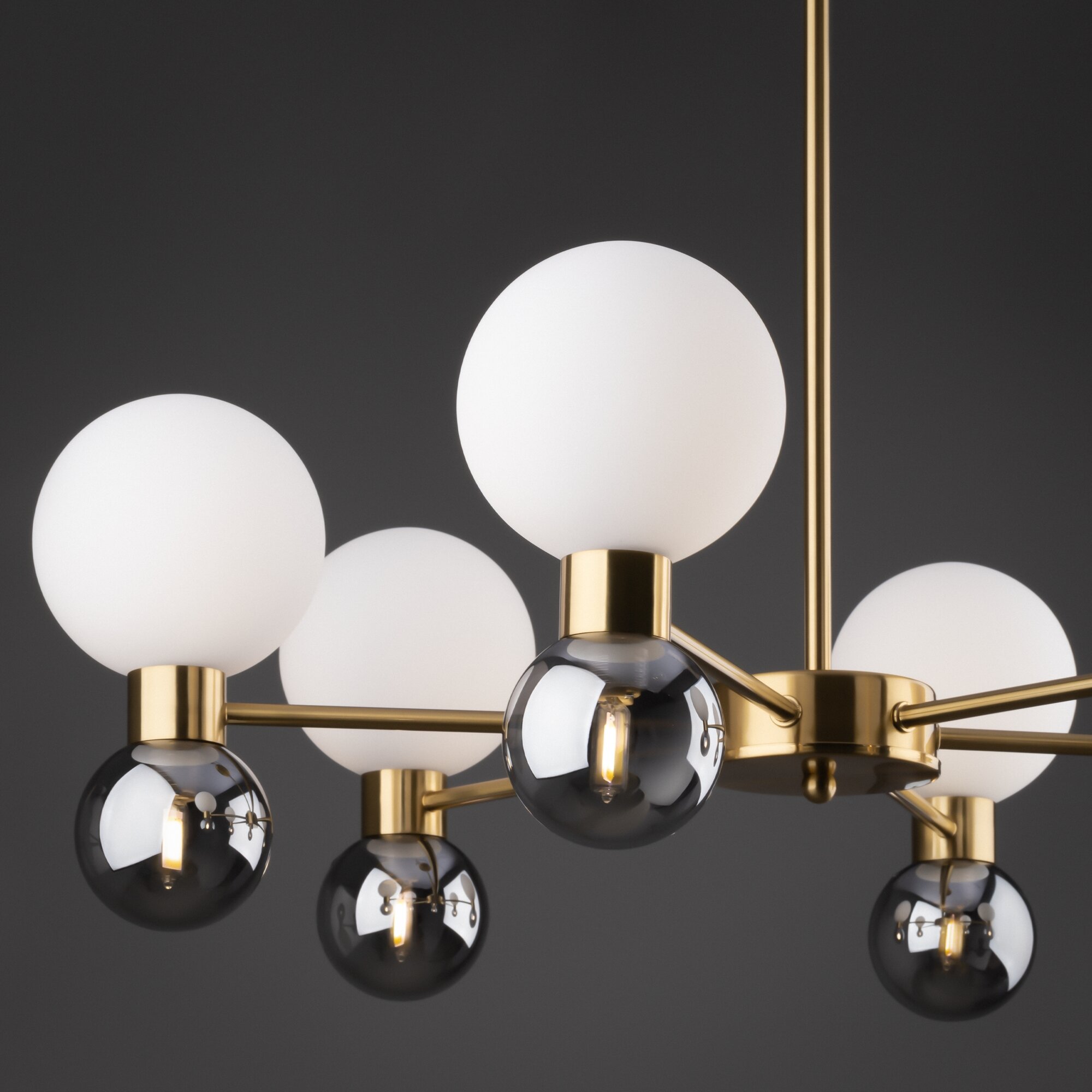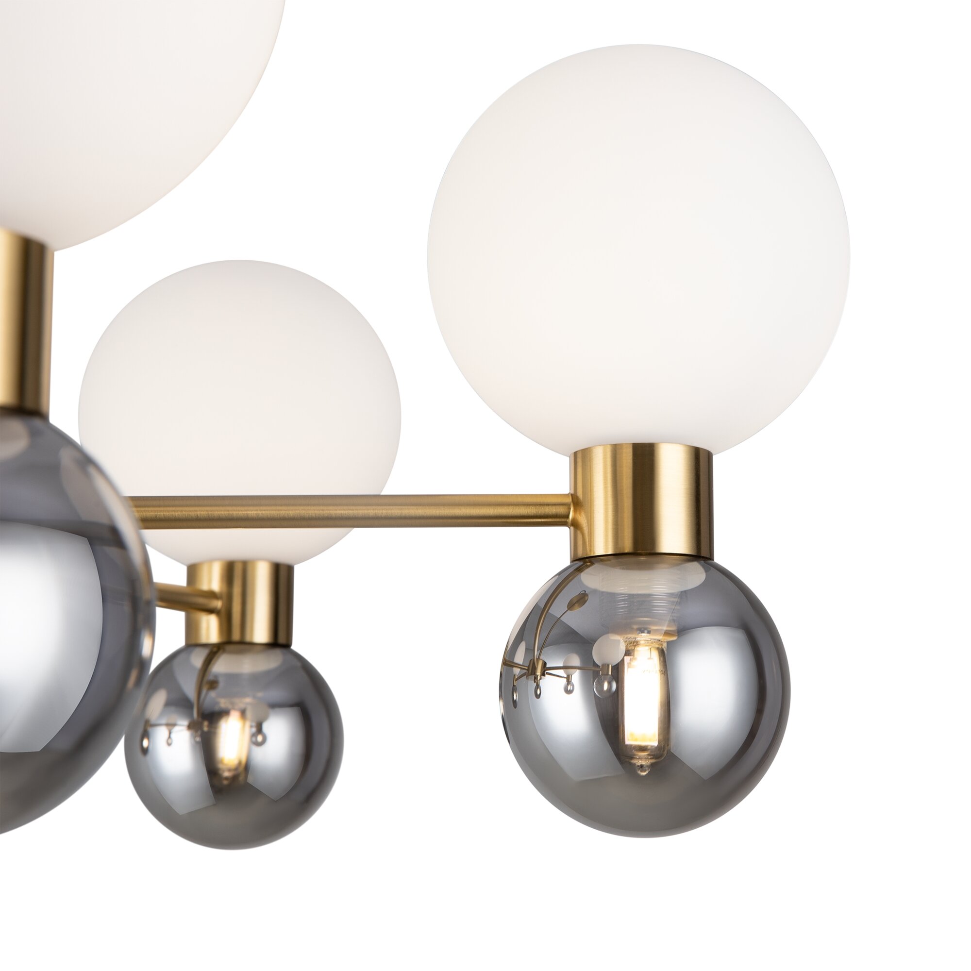Металлическая арматура в цвете латунь. Открытые сферические плафоны в 2-х цветах: тёплый белый и тёмный гальванизированный. Плафоны разделены металлической вставкой в цвет арматуры. Источником света является лампа с цоколем G9. Для бра - цоколь Е27.