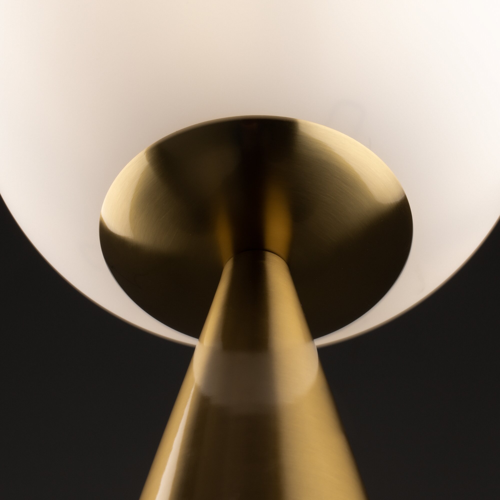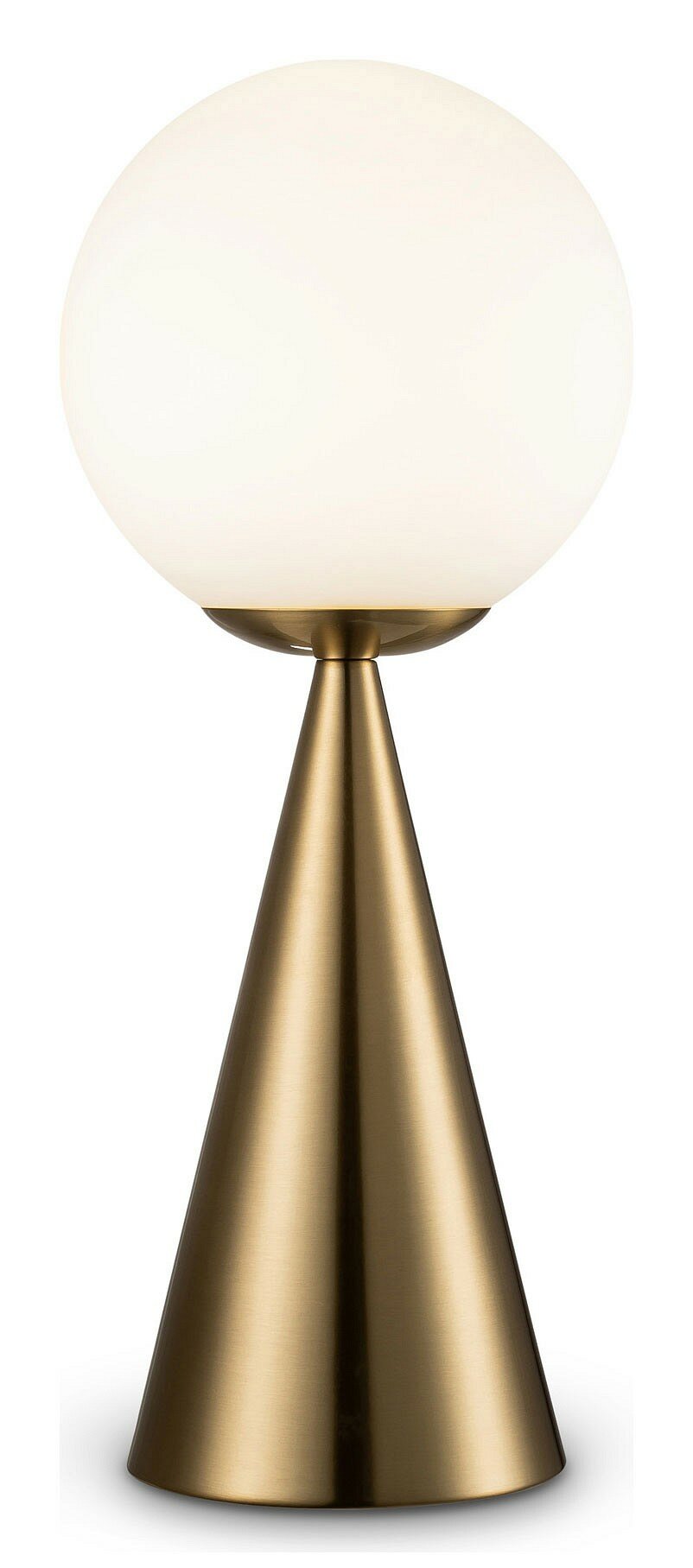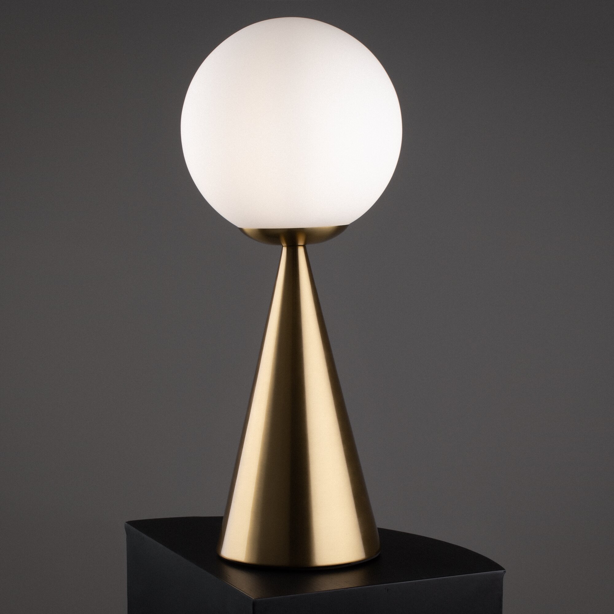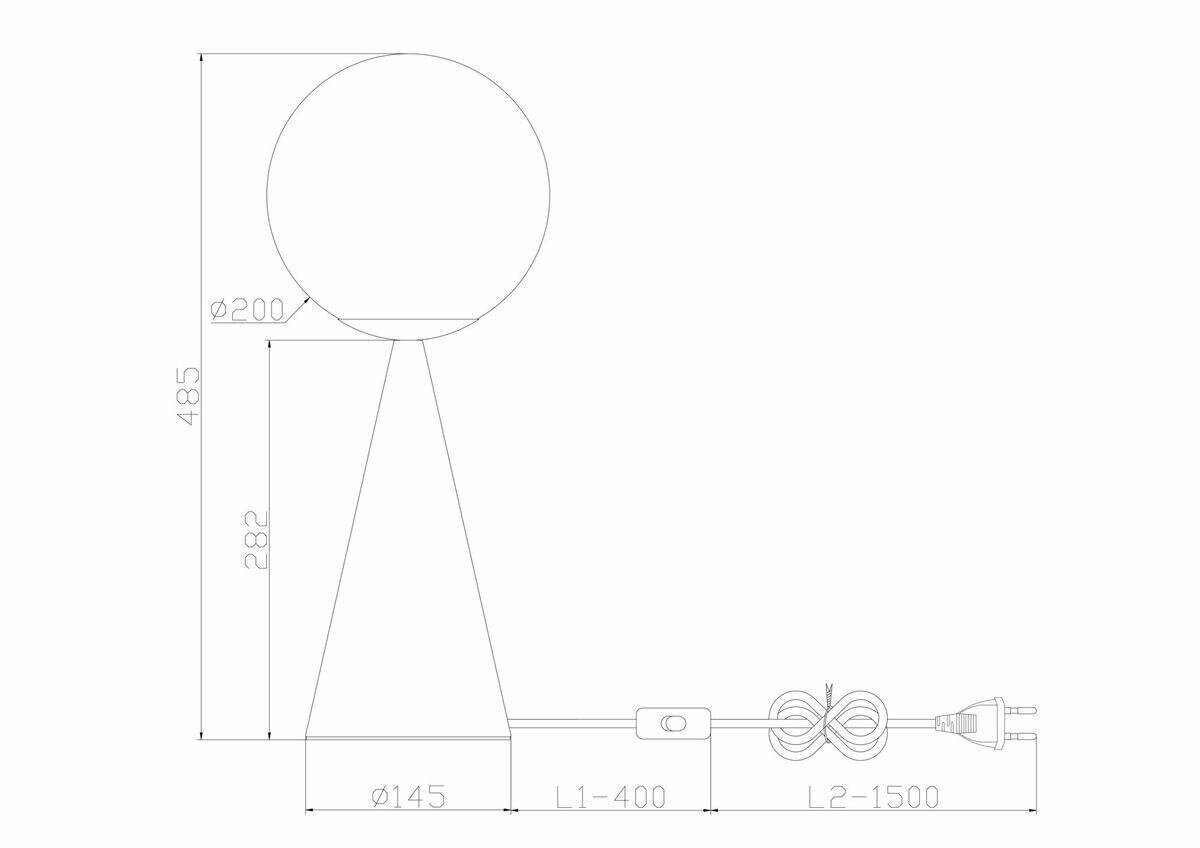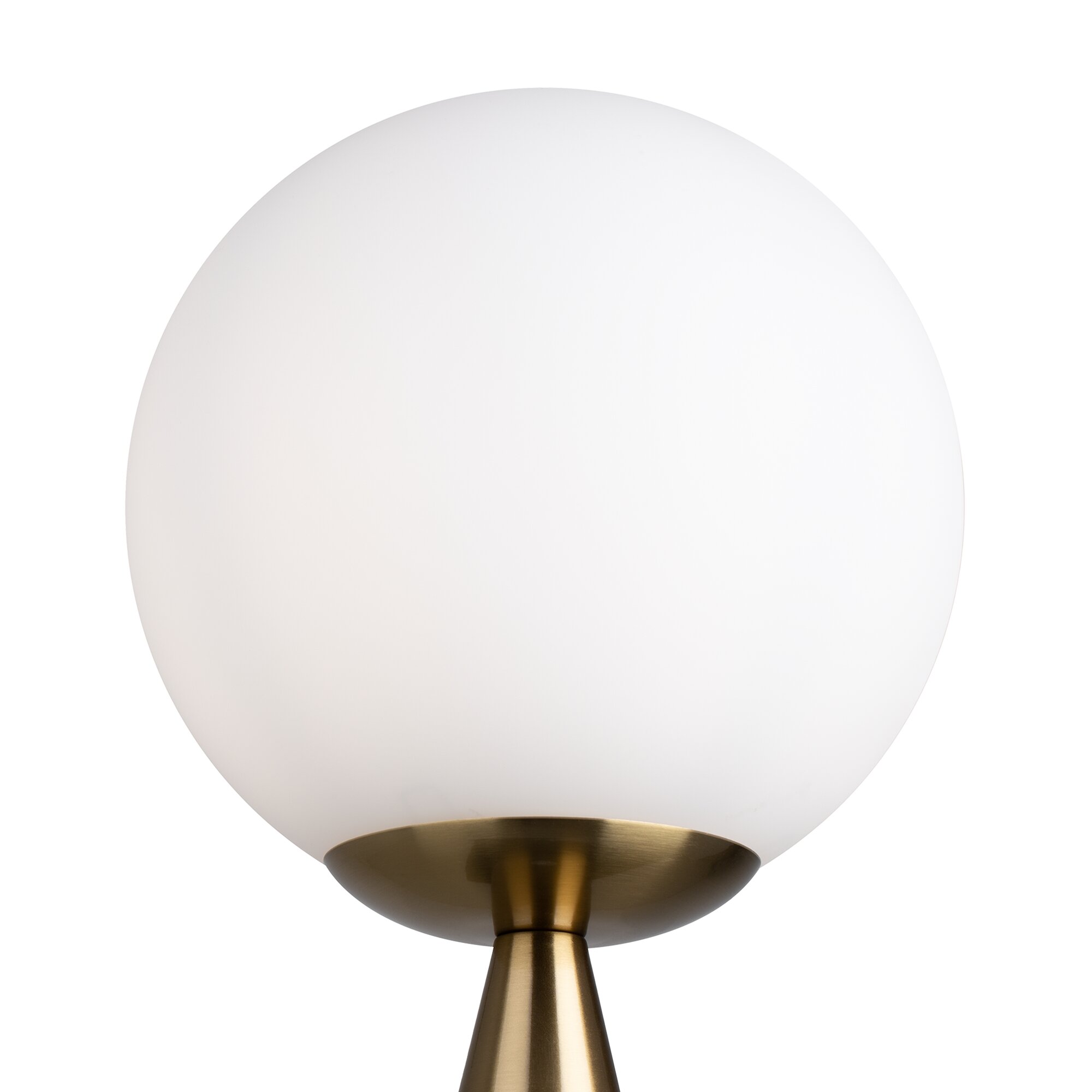 Материал арматуры — металл, цвета - латунь, черный. Плафон-сфера из белого матового цвета. Функция touch-dimming позволяет регулировать яркость света. Источник света - лампа с цоколем Е14.