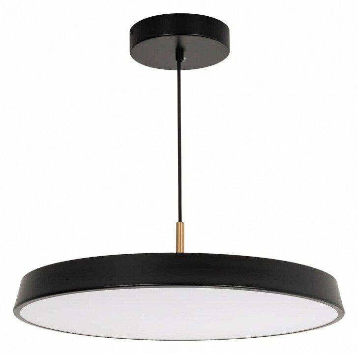 Подвесной светильник. Мощность 37 Вт, св. поток 3071 лм, 83 лм/Вт, теплый 3000 K, CRI>80, угол 120°, напряжение питания 230 В. Черный круглый корпус из стали, экран PMMA, степень защиты IP20. Размер: диаметр 500 мм, высота 50 мм, размер чаши: диаметр 160 мм, высота 35 мм. Монтаж подвесной, длина подвеса 1200мм. Драйвер 40-67 В, 600 мА, пульсация