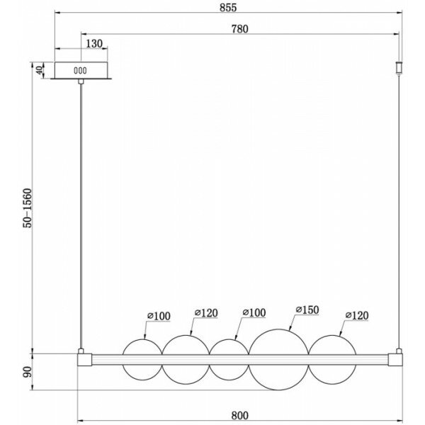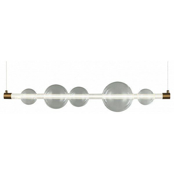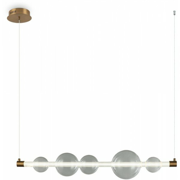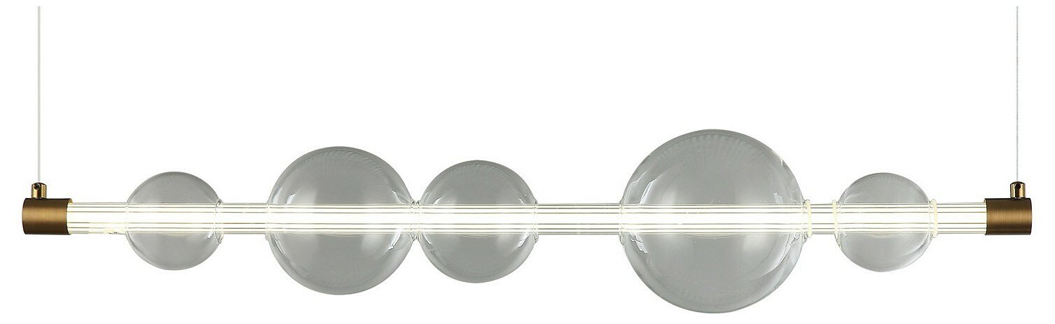 Арматура — металл, цвет — латунь. Тренд «invisible light» - LED-источник света скрыт в горизонтальной стеклянной трубке, пронизывая ряд декоративных плафонов-шаров разного размера из прозрачного стекла. Воздушная минималистичная горизонтальная конструкция. Регулируемая высота. Цветовая температура - 3000К.