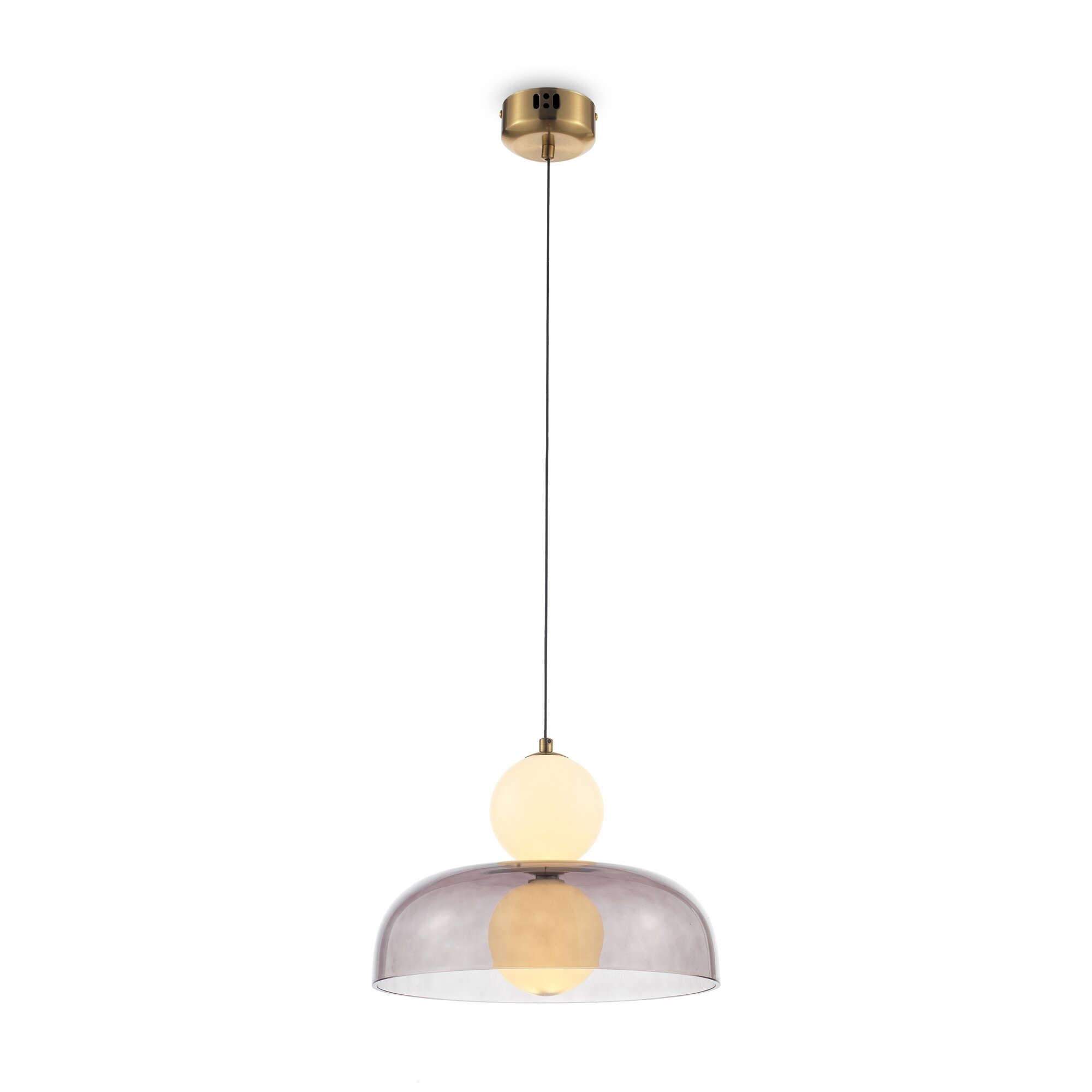 Арматура - металл, цвет - латунь. Стеклянные плафоны в виде сдвоенных матовых “шариков” дополнены широкими декоративными плафонами из стекла двух оттенков: дымчатый и янтарный. LED-источник света. Цветовая температура - 3000К. Светильники подойдут для светлых интерьеров и детских комнат.