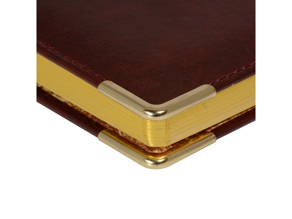 Ежедневник Persona – идеальный баланс между практичностью и статусностью. Великолепный переплетный материал прошит тонкой шелковой нитью в цвет обложки. Благородство в облик ежедневника добавляют металлические уголки и золотой обрез. На контрасте с темным цветом обложки, блок состоит из листов бежевого цвета плотностью 70 г/кв. м. Раздел планирования дополнен справочной информацией на 14 страницах и телефонной книгой на 19 страницах. Вечная и никогда не стареющая классика! Тиснение (Блинт) на данный товар осуществляется бесплатно. Оплачивается только настройка оборудования в размере 5800 рублей на весь тираж.
