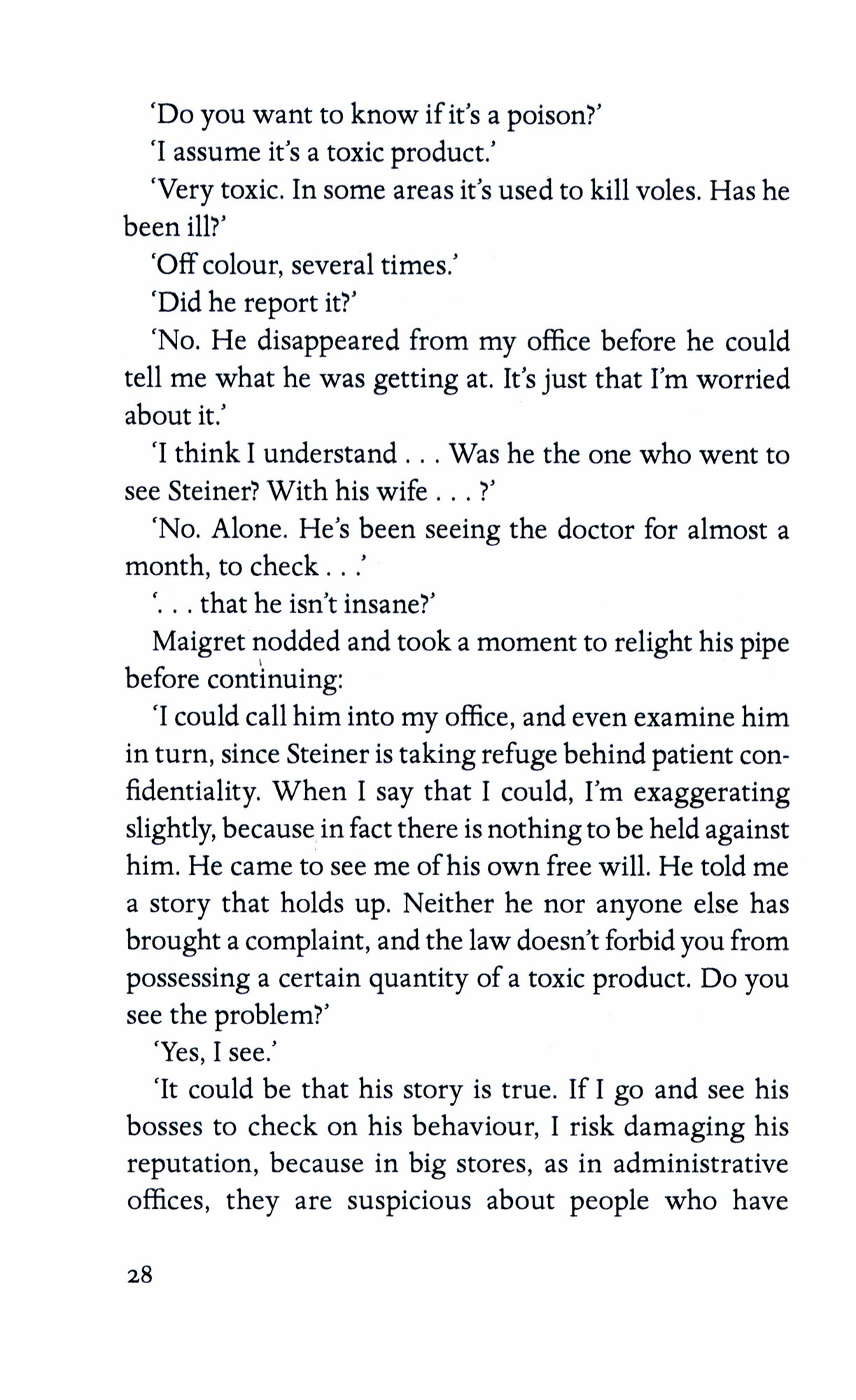 When a salesman from a Paris department store confides his secret fears to Maigret, the Inspector soon becomes caught up in a treacherous feud between husband and wife that is not as clear cut as it seems.