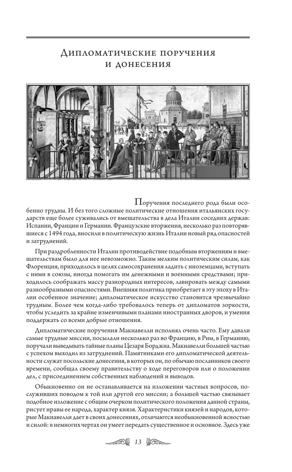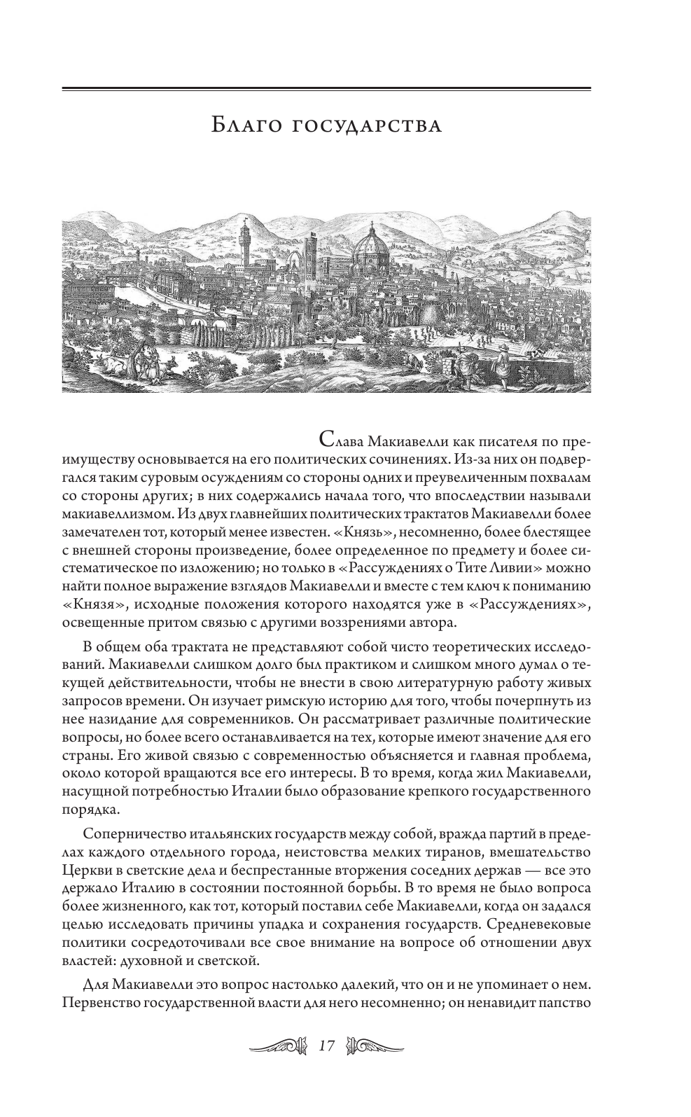 Философ и мыслитель Никколо Макиавелли, без которого невозможно представить себе Италию эпохи Возрождения, оставил после себя, быть может, не такой яркий след, как его деятельные, энергичные современники — представители кланов Борджиа и Медичи. Выходец из семьи небогатого адвоката, будущий автор «Государя» никогда не переставал учиться, сам дал себе образование университетского уровня, а в эпоху военных переворотов, хрупких союзов и искусных интриг оставался человеком книжным, строил карьеру чиновника и вел жизнь преимущественно канцелярскую. Его влияние на культуру и философию Ренессанса, а через них и на всю политическую историю, было более глубинным. Позиция наблюдателя при сильных мира сего давала ему неиссякаемую пищу для размышлений, которые Макиавелли с присущими ему лаконичностью и точностью изложил в письменных трудах. Меткость его исторических оценок снискала ему славу едва ли не официального хроникера своей взрывной эпохи, которая не перестает будоражить умы, а тонкое политическое чутье, глубокое знание военного дела и искусства управления государством подарили миру в его лице одну из ключевых фигур политической науки.