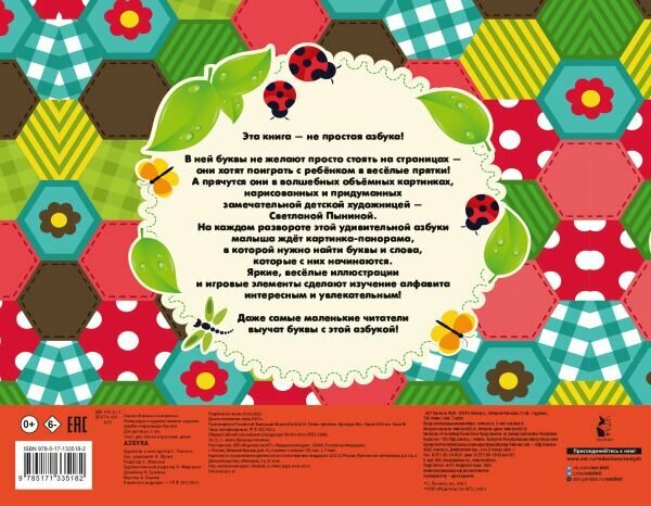 В ней буквы не желают просто стоять на страницах — они хотят поиграть с ребёнком в весёлые прятки! А прячутся они в волшебных объёмных картинках, нарисованных и придуманных замечательной детской художницей — Светланой Пыниной.