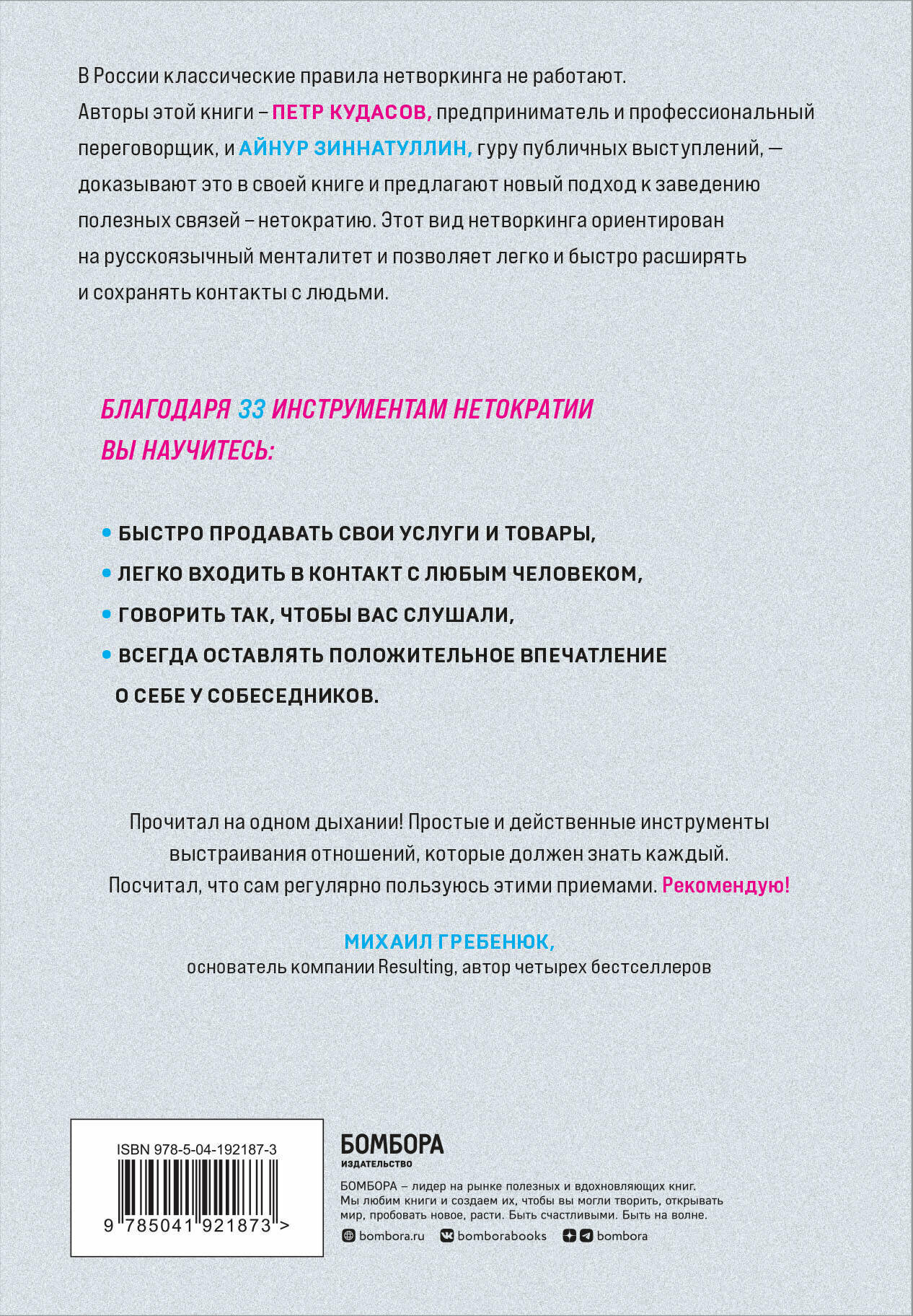 В России классические правила нетворкинга не работают. Авторы этой книги — Петр Кудасов, предприниматель и профессиональный переговорщик, и Айнур Зиннатуллин, гуру публичный выступлений — доказывают это в своей книге и предлагают новый подход к заведению полезных связей — нетократию. Этот вид нетворкинга ориентирован на русскоязычный менталитет и позволяет легко и быстро расширять и сохранять контакты с людьми.