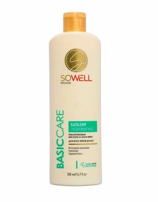 Бальзам SoWell Basic Care – идеальный выбор для тех, кто привык ежедневно мыть голову. Бальзам с мощной увлажняющей формулой эффективно смягчает волосы, облегчая расчесывание, делает их гладкими и послушными, препятствует спутанности волос. Улучшает состояние волос, предотвращает сухость и раздражение, улучшает эластичность и послушность волос, повышает их сопротивляемость повреждениям, сокращает ломкость. Содержит супер увлажняющий комплекс, Hydro Smart Technology, правильно подобранные компоненты и пропорции которого обеспечивают настоящую интеллектуальную защиту от обезвоживания и укрепление структуры волос всех типов, а также поддерживают гидролипидный баланс кожи головы. Результат: эффективно кондиционирует, дополнительно увлажняет, восстанавливает естественную гладкость и блеск. Комплекс Hydro Smart Technology содержит гиалуроновую кислоту, алоэ вера, витамины и пантенол.