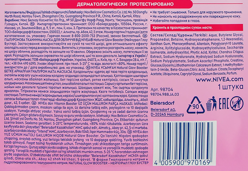 Попробуйте новую гиалуроновую тканевую маску для лица NATURAL GLOW BOOSTER от NIVEA. Кожа более сияющая и гладкая за 10 минут — теперь реально с новой маской NATURAL GLOW BOOSTER от NIVEA. Формула с активными компонентами: гиалуроновой кислотой и Витаминами C и E, известными своими антиоксидантными свойствами, интенсивно увлажняет, помогает вернуть естественное сияние кожи и делает поры менее заметными. Дерматологически протестировано.