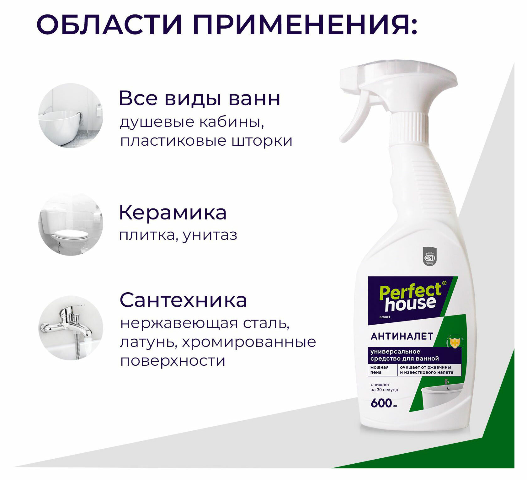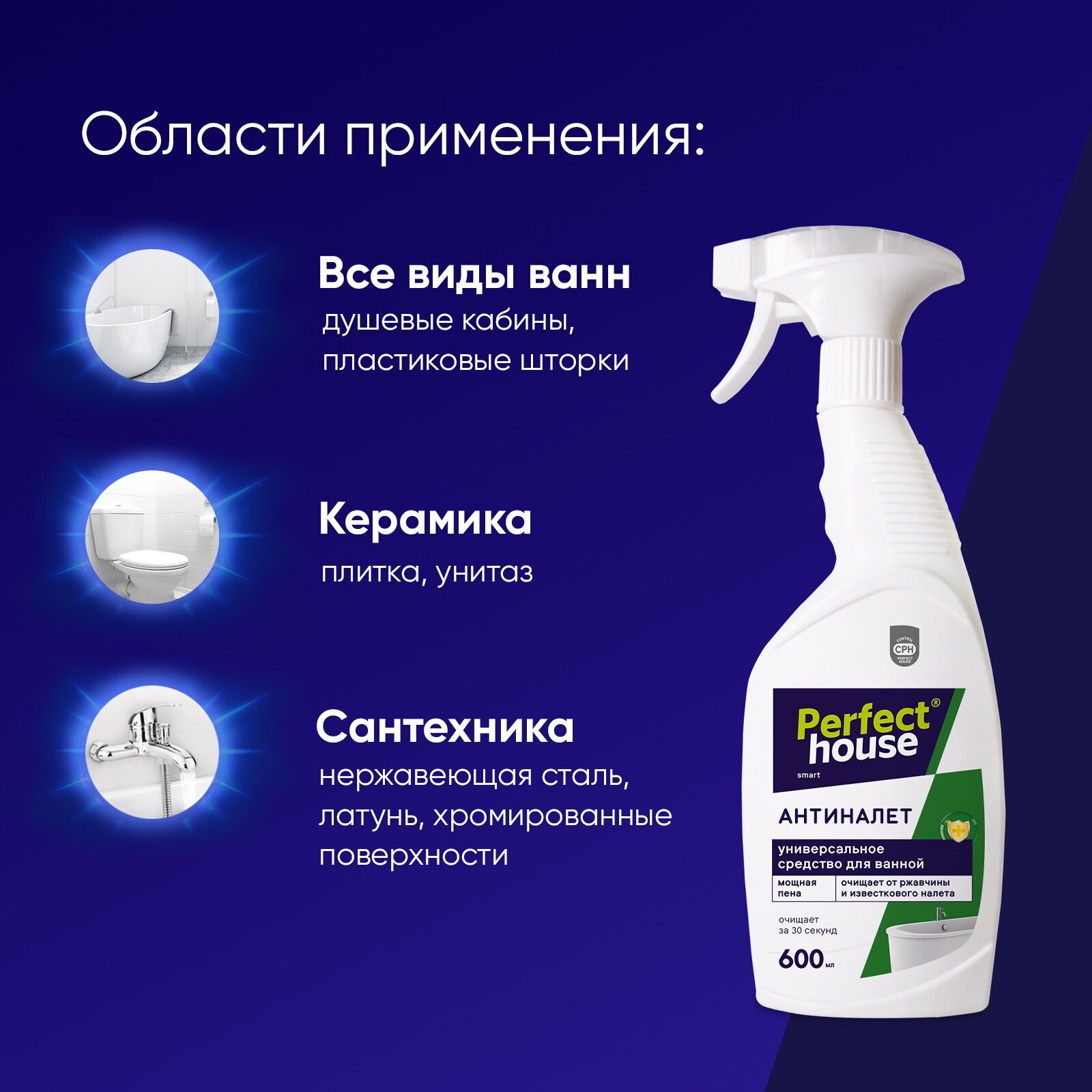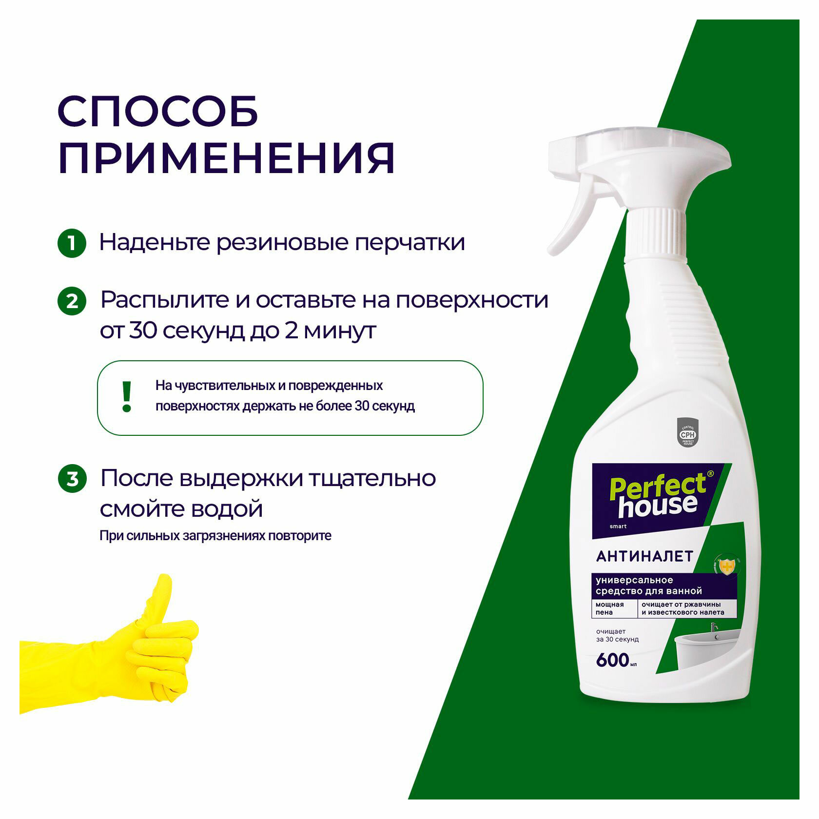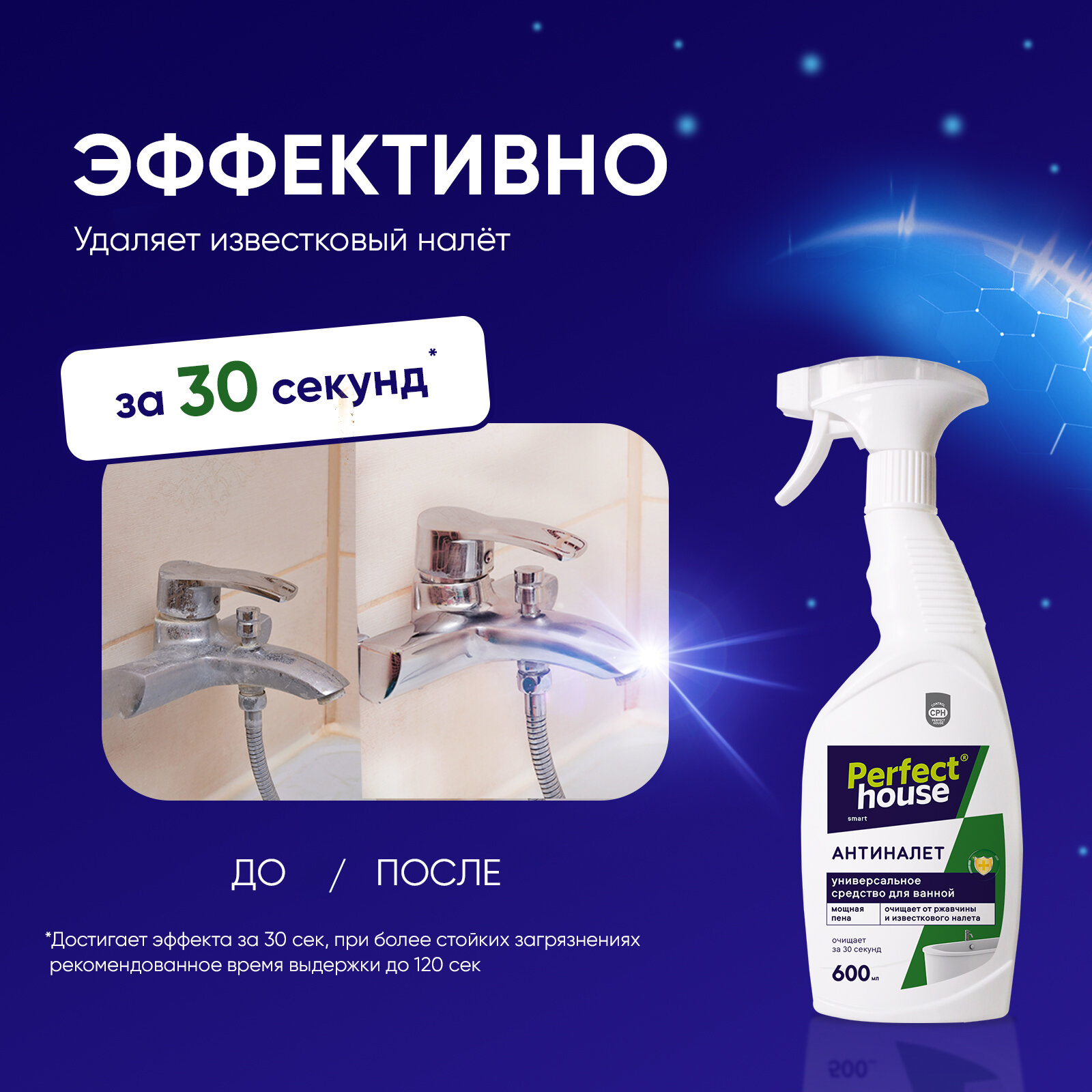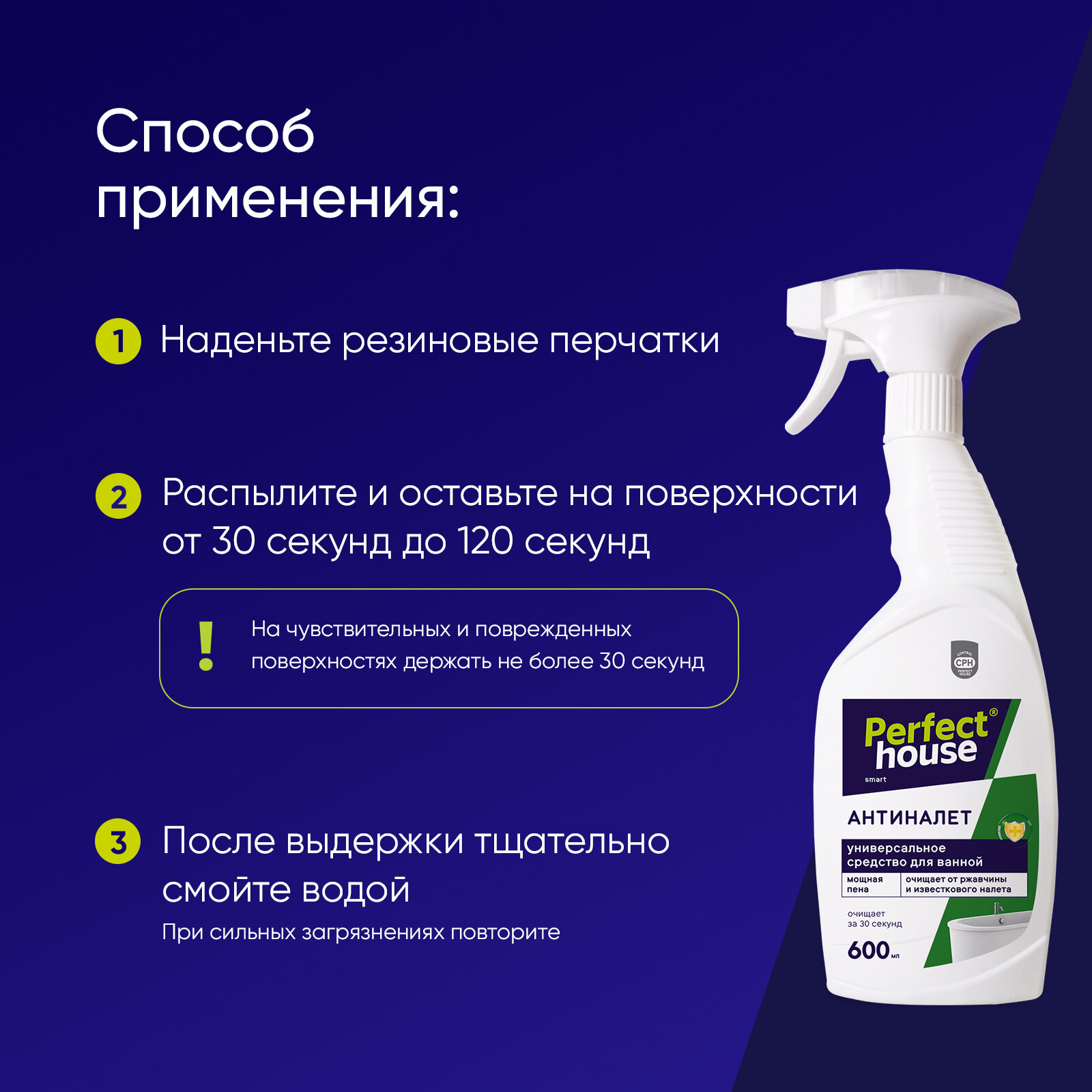 Средство антиналет Perfect House удаляет известковый налет, коррозию и другие солевые отложения с нержавеющей стали, латуни, хромированных поверхностей, фарфора, керамической плитки, стекла, пластика всего за 30 секунд! Активные чистящие вещества спрея отличаются глубоким воздействием, которые без усилий и разводов выводят налет, ржавчину и желтые пятна, при этом оставляют покрытия целыми и блестящими, продлевая срок службы.
