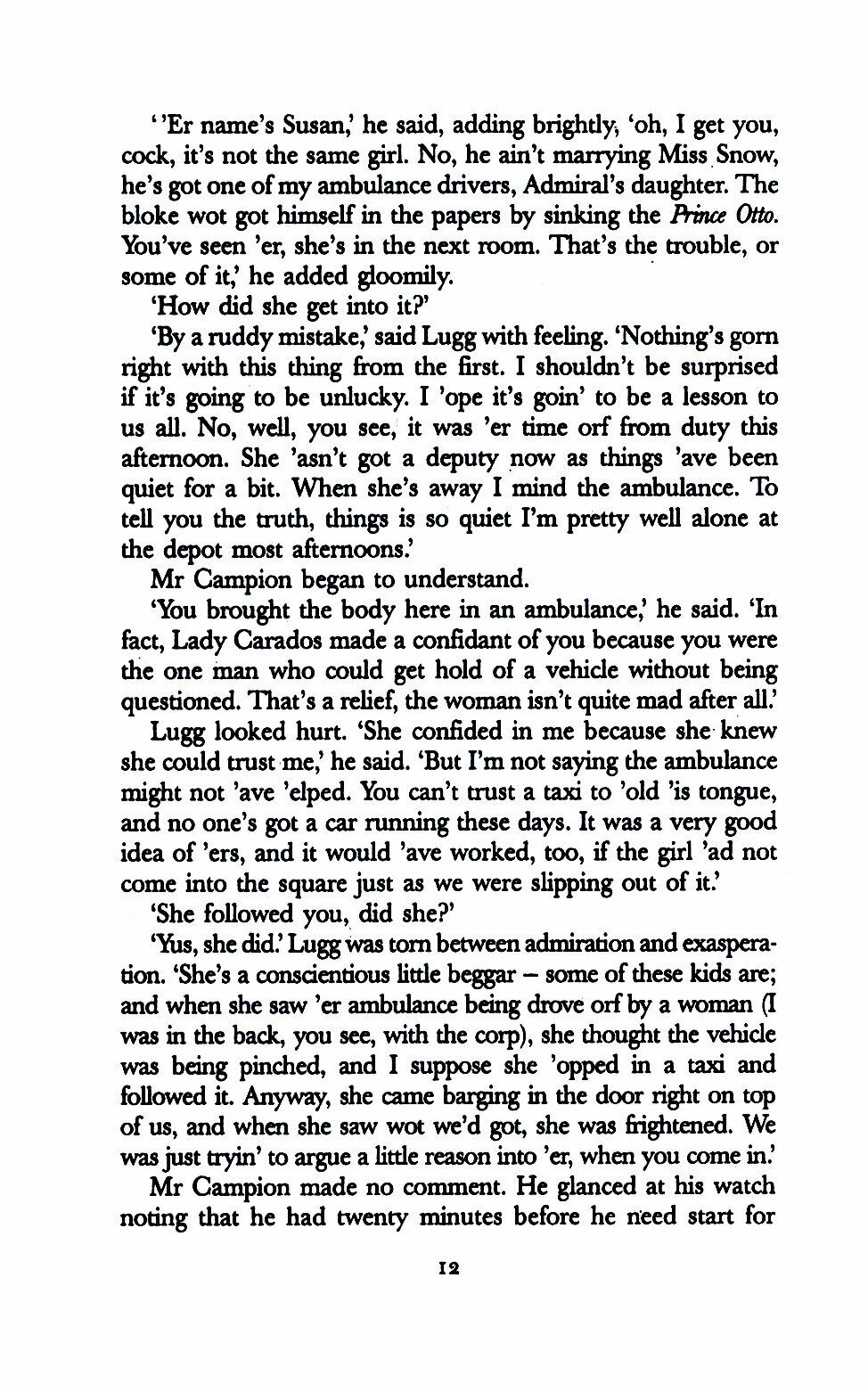 Just returned from years overseas on a secret mission, private detective Albert Campion is relaxing in his bath when his servant Lugg and a lady of unmistakably aristocratic bearing appear in his flat carrying the corpse of a woman. At first Campion is unwilling to get involved, but he is forced to bring his powers of protection to bear on the case, and to solve not only the mystery of the murdered woman but also the alarming disappearance of some well-known art treasures.