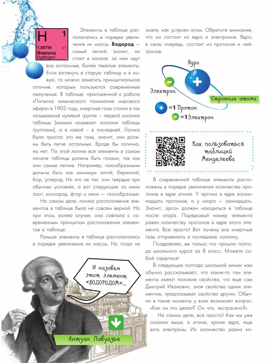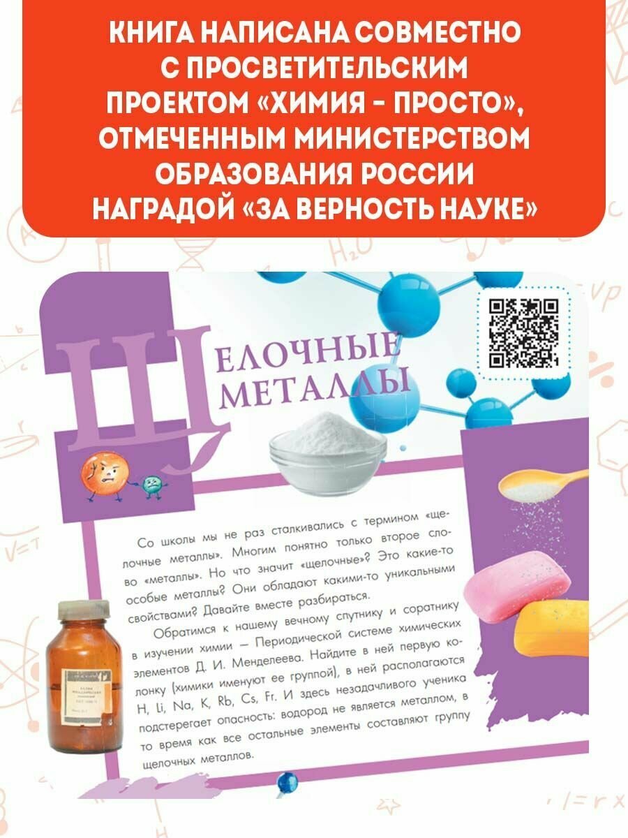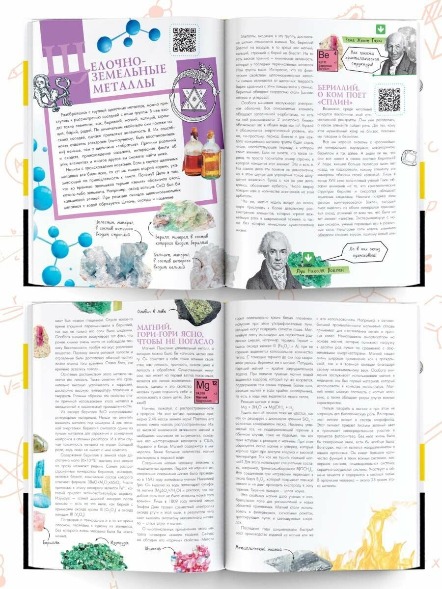 Ее авторы — Александр Иванов и Игорь Гордий – молодые ученые, знающие про мышьяк, фтор и радиоактивный уран столько, сколько не расскажет ни один школьный преподаватель. Ведь школьная программа охватывает далеко не все, и как раз то, что она не охватывает, — наиболее интересно. Принципы построения Периодической таблицы, истории открытия химических элементов, любопытные случаи из жизни химиков, интересные свойства различных элементов и их применение в обыденной жизни — все это и многое другое — на страницах книги "Химические элементы". А для тех, кто хочет узнать о химии еще больше, авторы добавили в книгу QR-коды с обучающими видео. Достаточно взять в руки смартфон и посмотреть видеоурок по той теме, которая тебя заинтересовала.