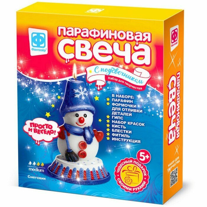 Набор для детского творчества. Серия Скульптор. Просто и весело! Создающие особый уют и атмосферу свечи - то, что нужно для праздника. А свечи, сделанные своими руками - тем более! К тому же, свеча или набор из нескольких - прекрасный подарок. Сначала делаем подставку из гипса и украшаем её, затем отливаем фигурную свечу. Вставляем её в подставку, зажигаем и празднуем! Отливаем чести свечи, расписываем их акриловыми красками, собираем: 1) Делаем подставку: Размешайте в миске 1 пакетик гипса с холодной водой (75 г) до получения смеси однородной массы. 1-2 мин. Получившуюся смесь залейте в формочку. Застывание гипса начнётся через 2-3 мин. Подождите 40 минут, пока смесь затвердеет, и достаньте фигурку. Оставьте подставку до полного высыхания (24 часа). 2) Делаем свечу: Вложите фитиль в пластиковую форму свечи. Растопите парафин одним из удобных способов, предложенным в инструкции, и залейте его в форму. Подождите несколько часов (3-4 ч.), пока парафин застынет. Извлеките свечу из формы. Раскрасьте свечу и подставку акриловыми красками из набора, смешивая цвета, добавьте блеска. Вставьте свечу в подставку.