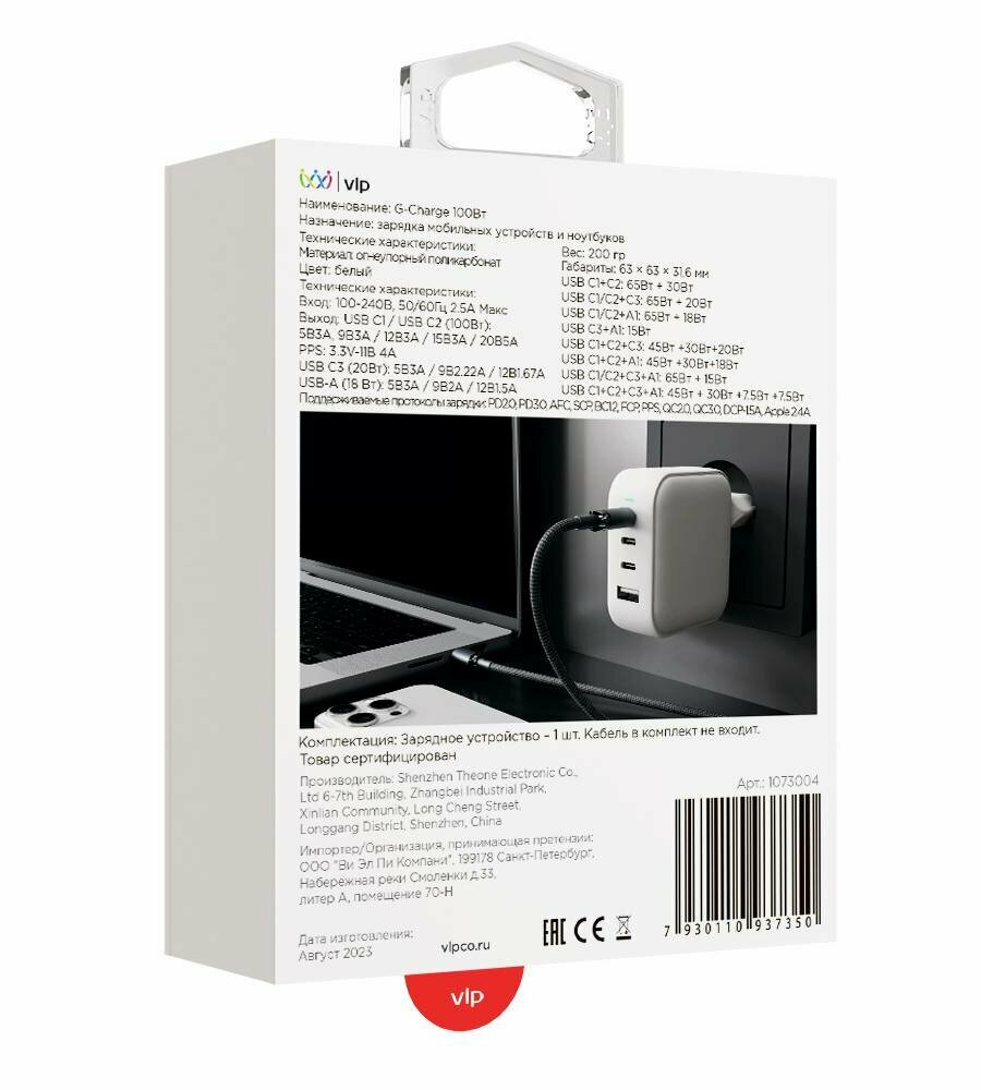 Сетевое зарядное устройство VLP G-Charge 100Вт 3*USB-C+USB-A PD QC белый G-Charge 3xUSB-C/USB-A (1073004) белый