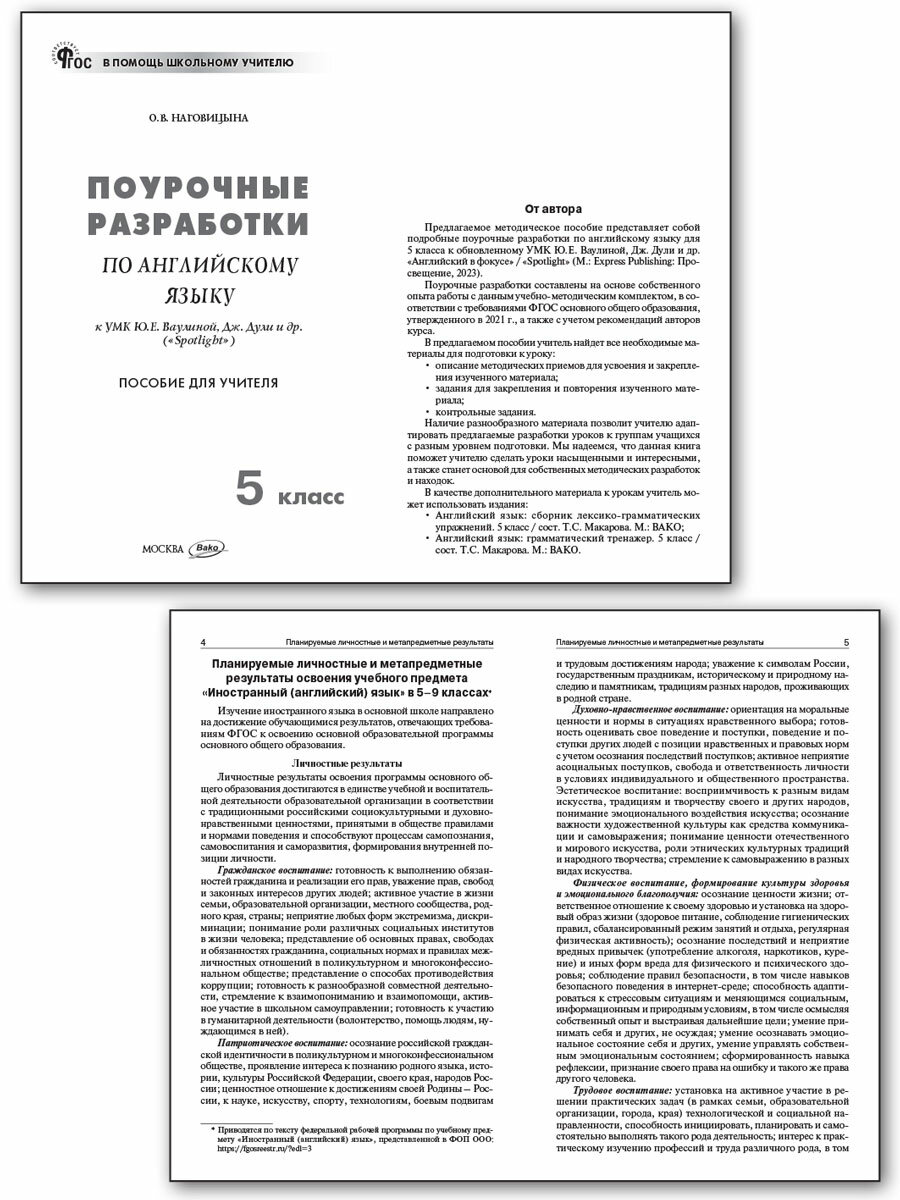 Поурочные методические разработки составлены по учебнику Ю.Е. Ваулиной, Дж. Дули и др. «Английский в фокусе» / «Spotlight» (М.: Express Publishing: Просвещение), входящему в действующий федеральный перечень учебников (приказ Минпросвещения России от 21.09.2022 № 858). Материал соответствует требованиям ФГОС-2021 и ФОП ООО (приказ Минпросвещения России от 18.05.2023 № 370). Учитель найдет здесь все необходимое для подготовки к уроку: тематическое планирование учебного материала, подробные сценарии уроков, методические рекомендации по организации работы учащихся, контрольные задания и многое другое.