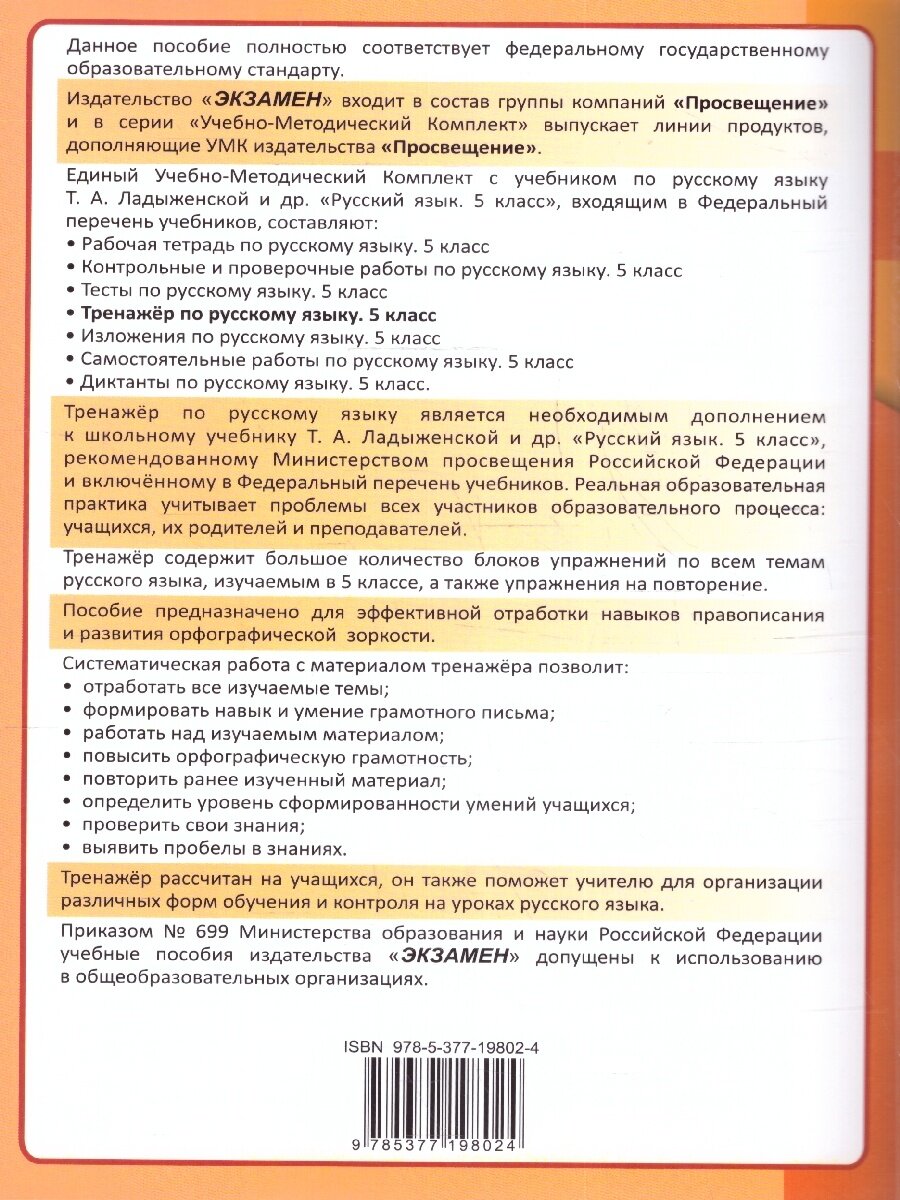 Тренажёр по Русскому языку. 5 класс. К учебнику Т. А. Ладыженской и др. (Галина Николаевна Потапова); Экзамен, 2026