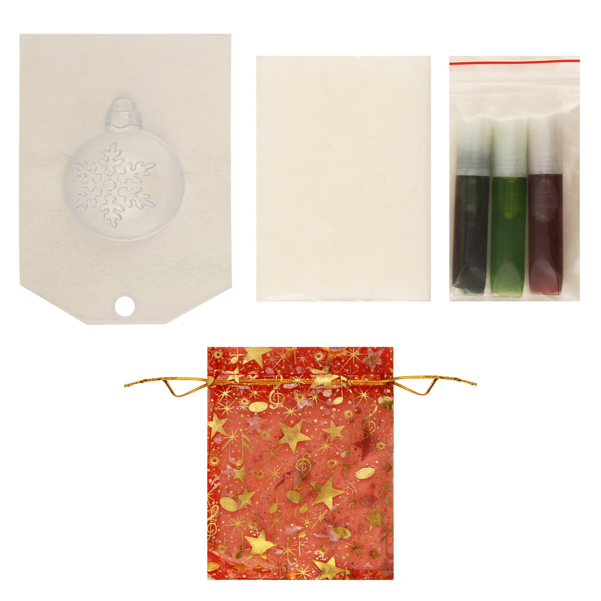 В состав набора входит: мыльная основа 100 гр., пищевые красители 3 цвета в тубах по 5мл., многоразовая форма для мыла, нарядный подарочный мешочек для упаковки готового мыла, пошаговая инструкция указана на упаковке.