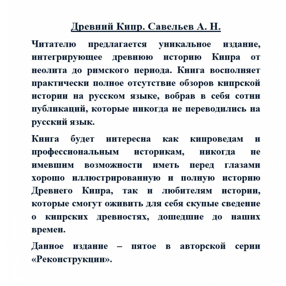 Читателю предлагается уникальное издание, интегрирующее древнюю историю Кипра от неолита до римского периода. Книга восполняет практически полное отсутствие обзоров кипрской истории на русском языке, вобрав в себя сотни публикаций, которые никогда не переводились на русский язык.