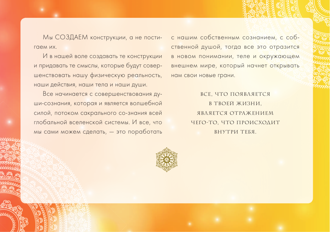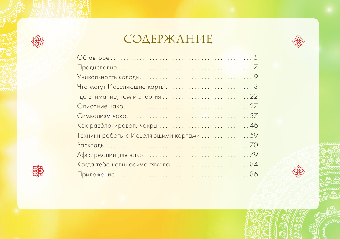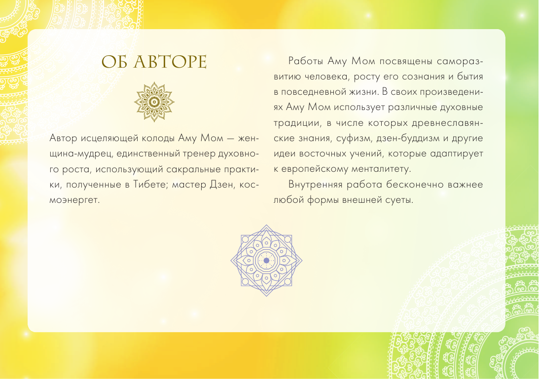 Эта уникальная исцеляющая авторская колода откроет внутреннее ви́дение и сокрытое в человеческом Подсознании; расскажет, как исцелить ситуацию, как жить дальше и где брать энергию, поможет найти ответы в себе и Вселенной.