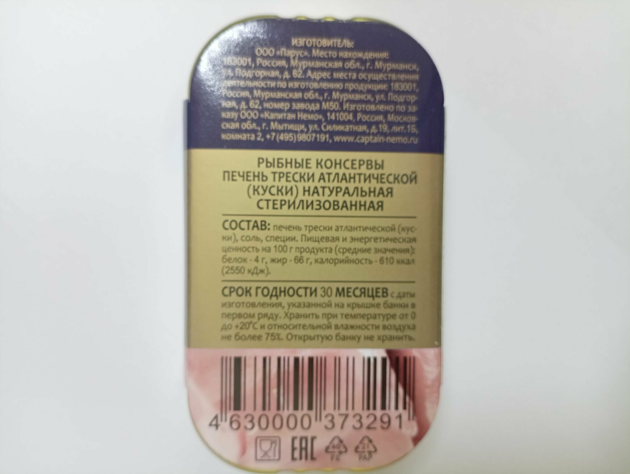 | Состав | печень трески атлантической (куски), соль, лавровый лист, перец душистый горошек |