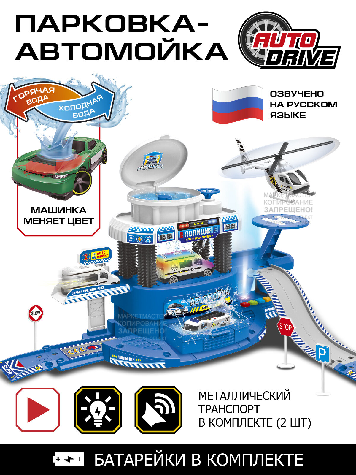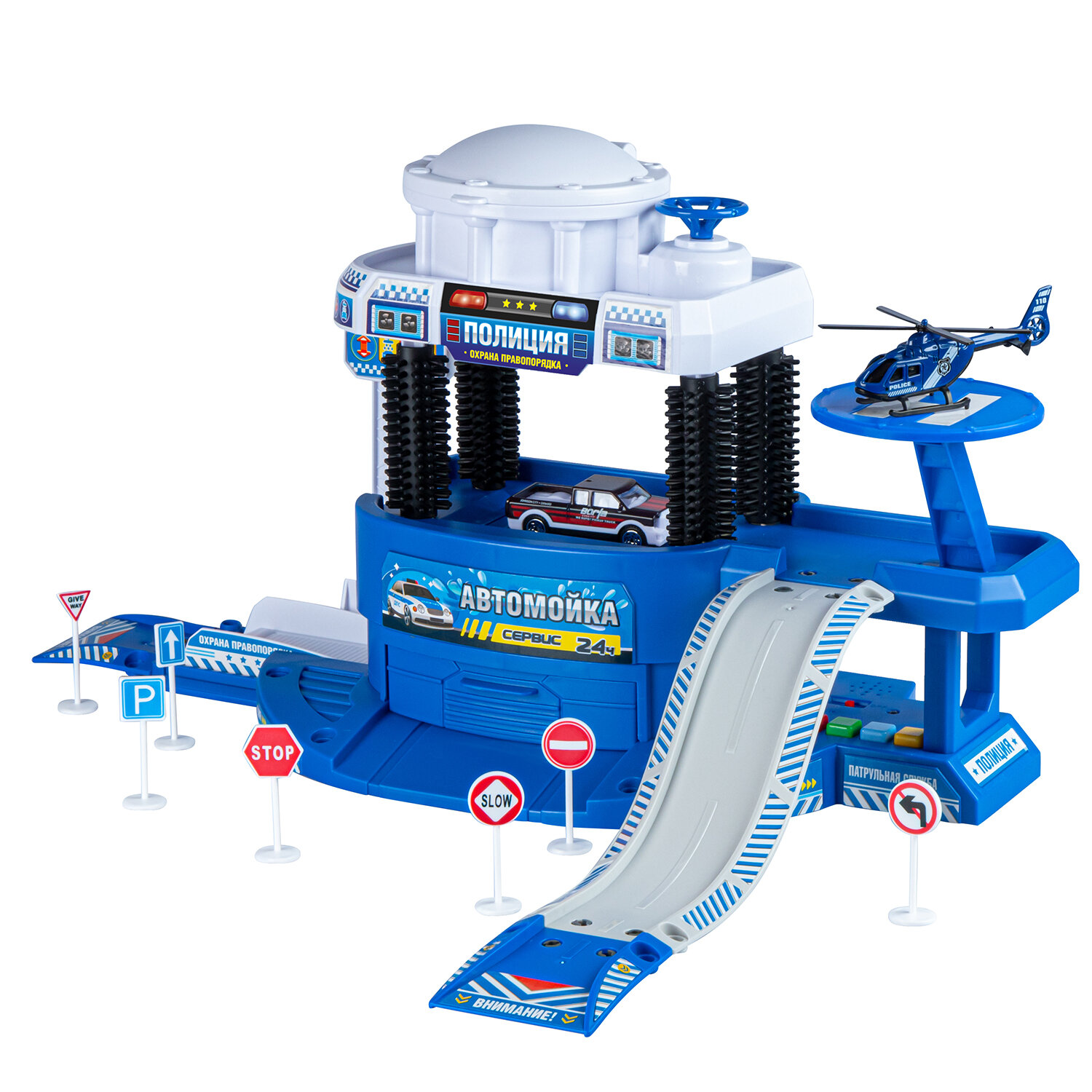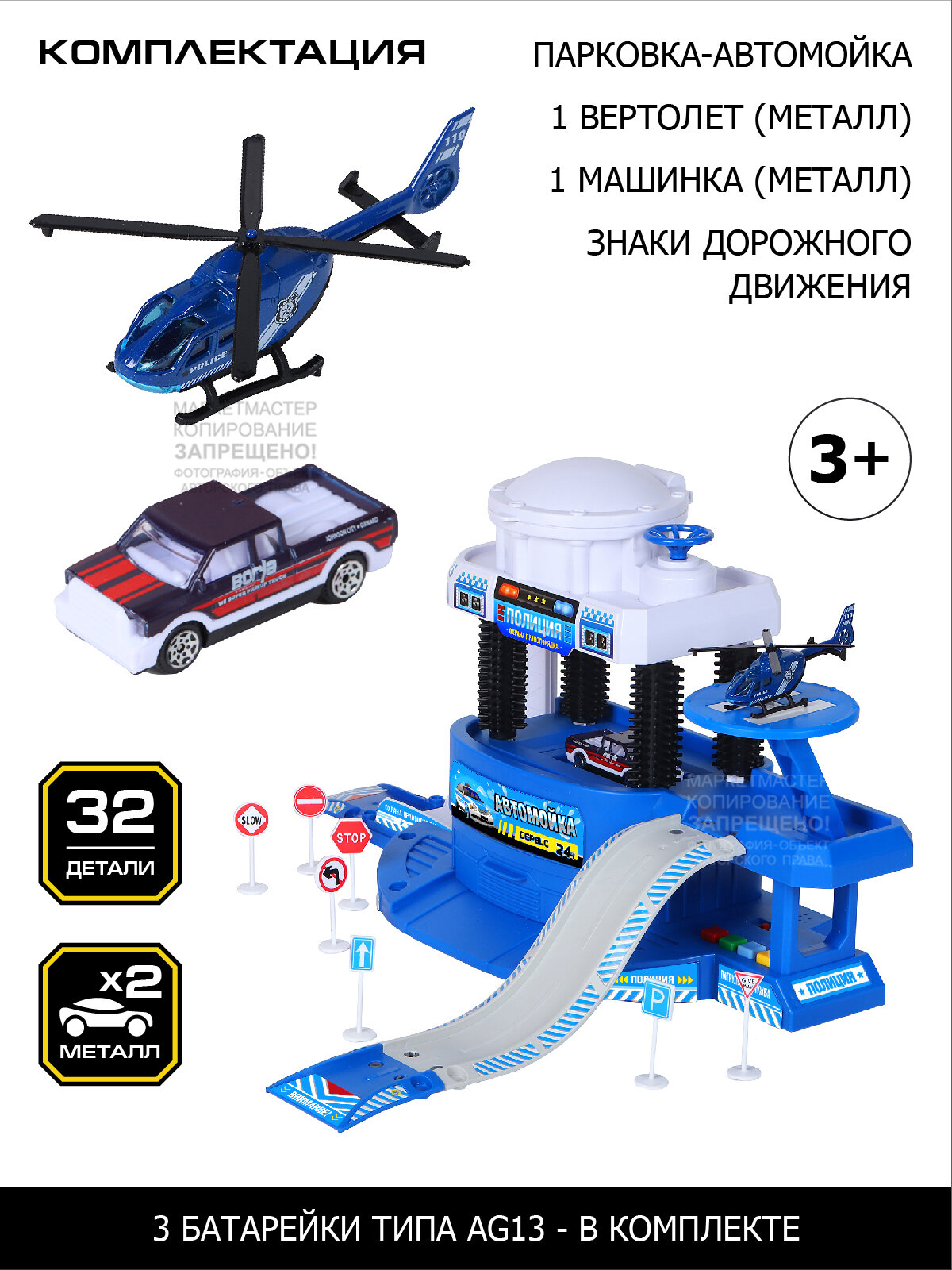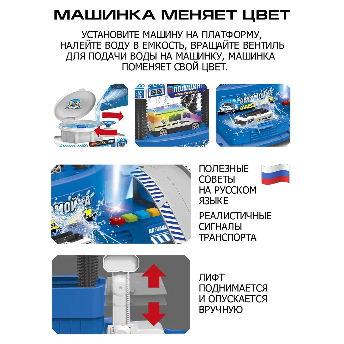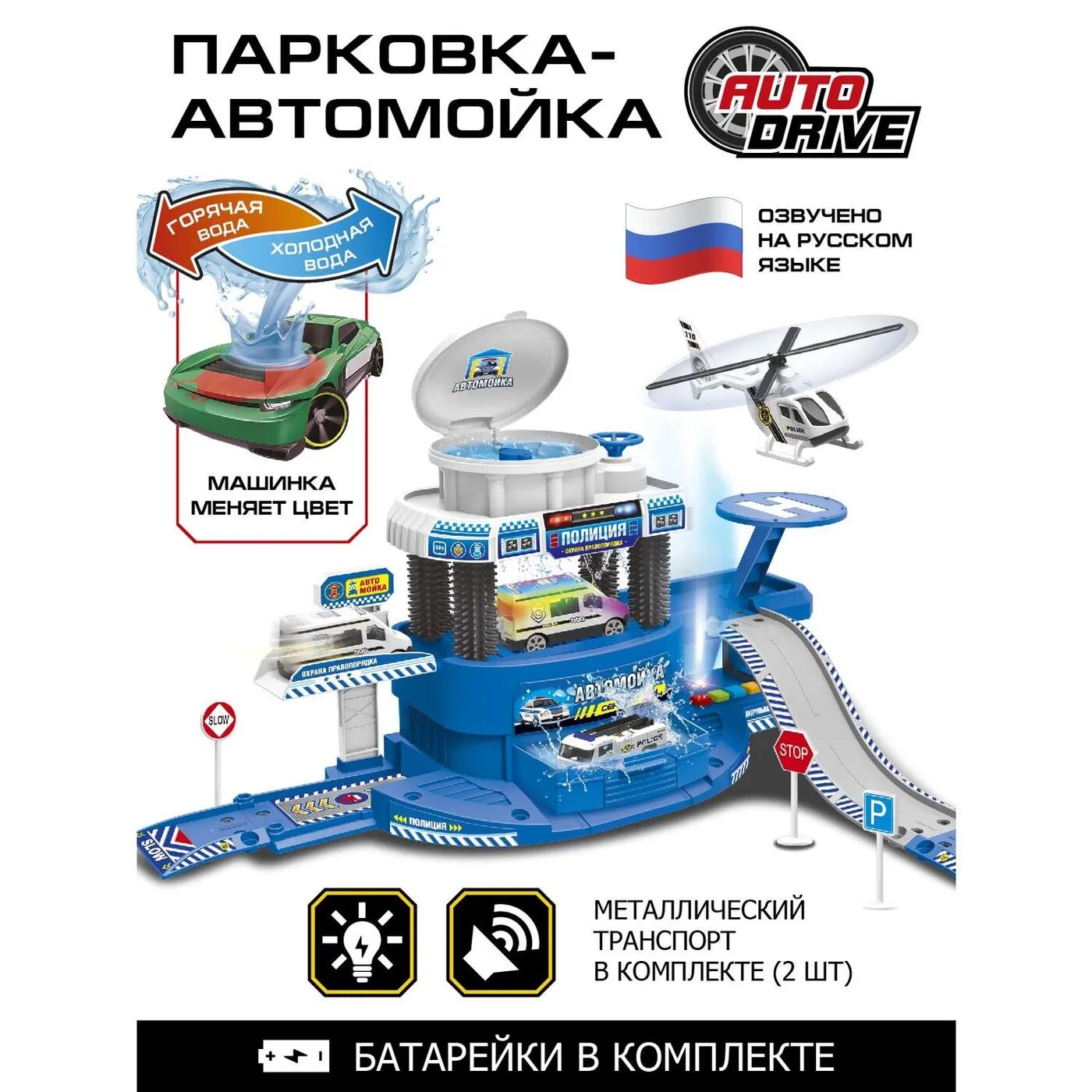 В комплекте с парковкой идет металлический транспорт; вертолет и машинка. Машинка меняет цвет под водой, что приведёт детей в особенный восторг! Парковка оснащена вертолетной площадкой и лифтом, на котором вручную можно поднять машинку на мойку.