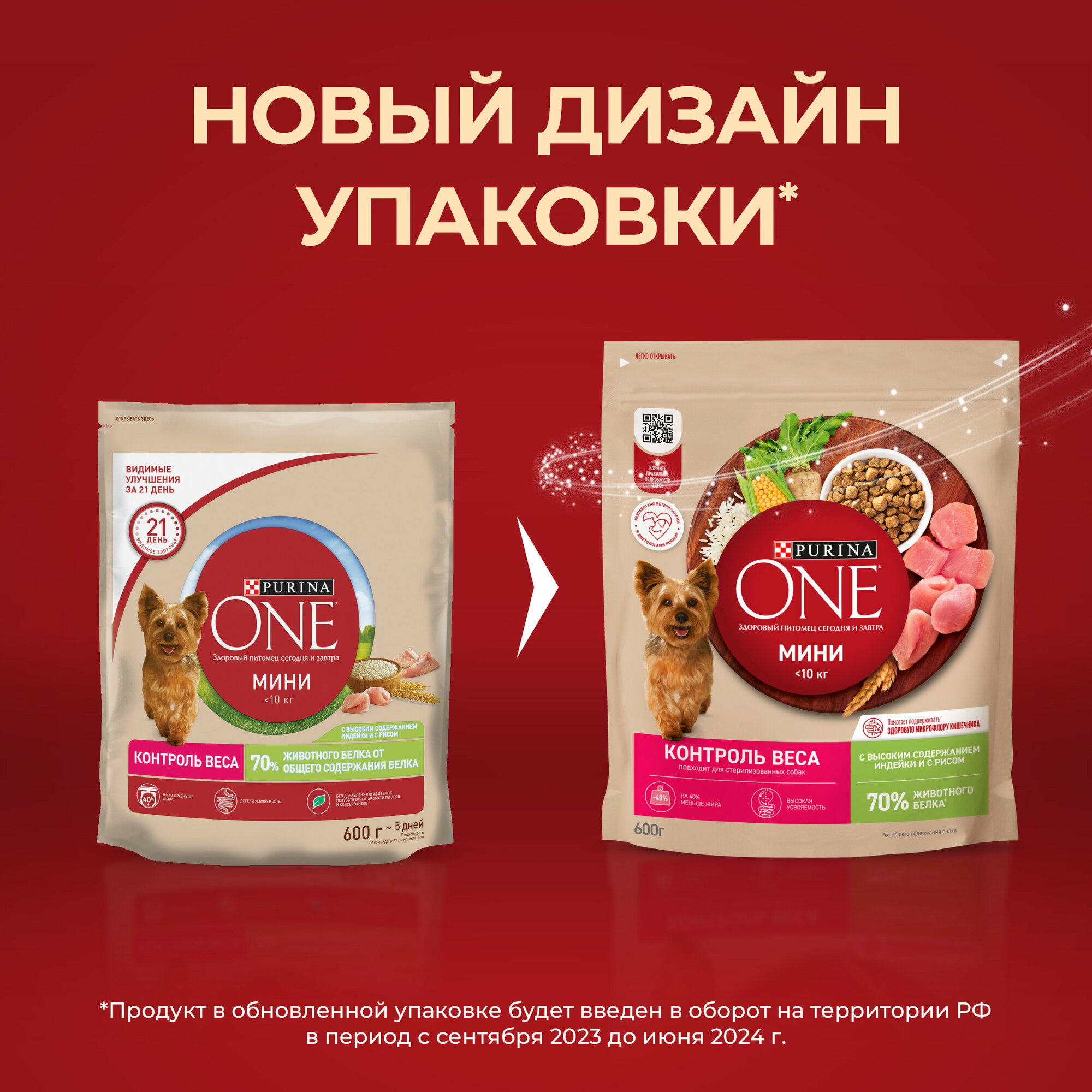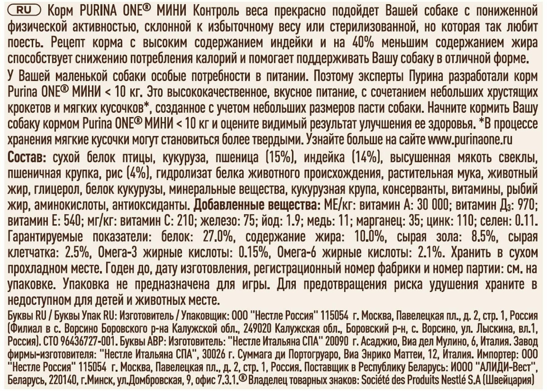 Purina One Мини "Контроль веса" для собак мелких пород, склонных к набору веса подходит если у питомцев склонность к набору/лишний вес. Помогает при ожирении, если соблюдать дозировку. Кусочки небольшие, твердые, хрустящие, с приятным ароматом. По составу претензий нет, все необходимое для питомца присутствует.