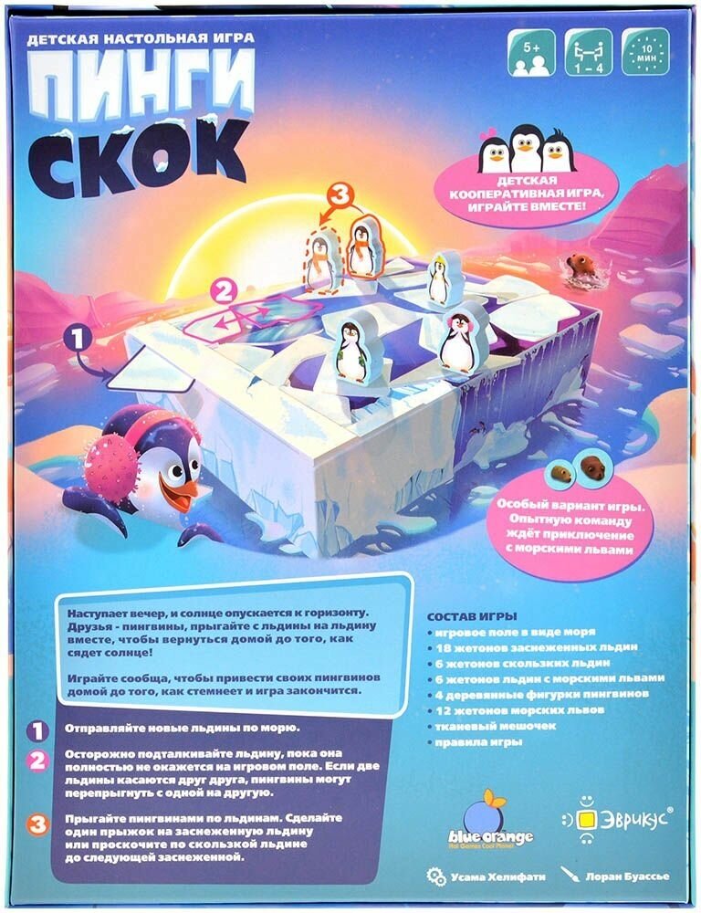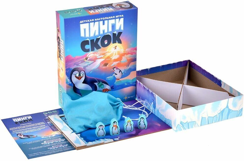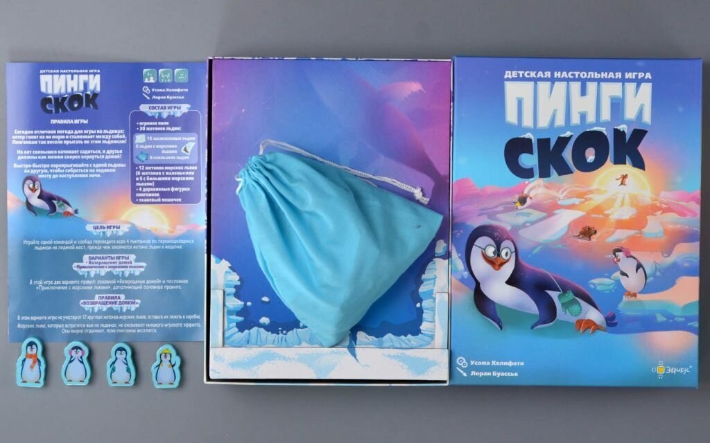 | Комплектация | Игровое поле, 30 жетонов льдин, 12 жетонов морских львов, 4 деревянные фигурки пингвинов, Тканевый мешочек, Правила игры. |