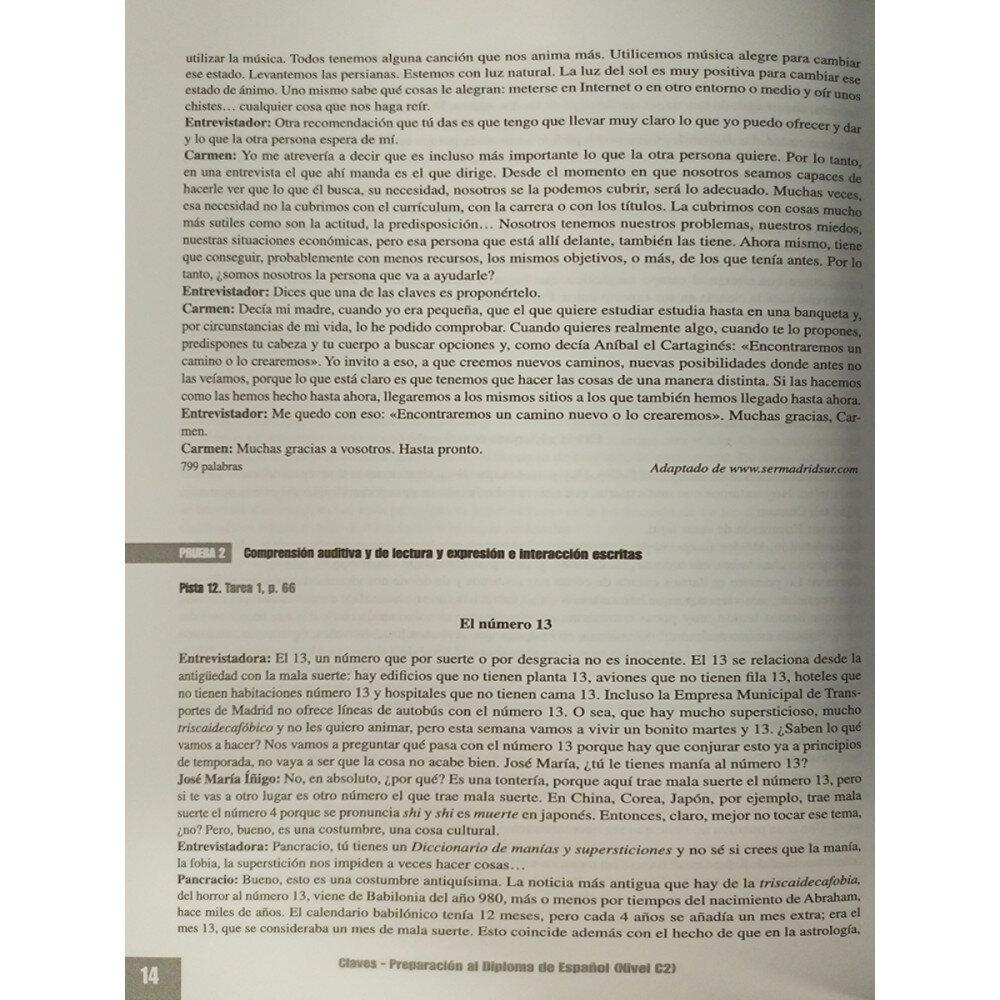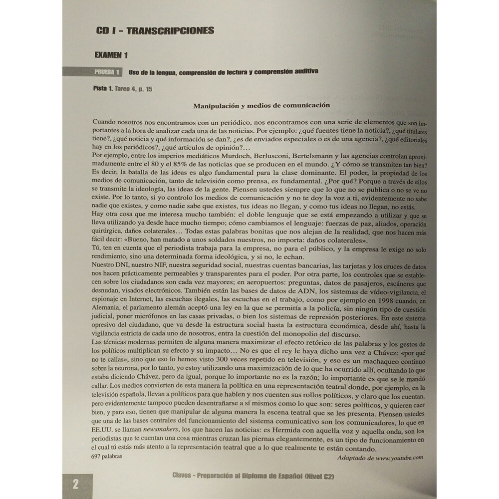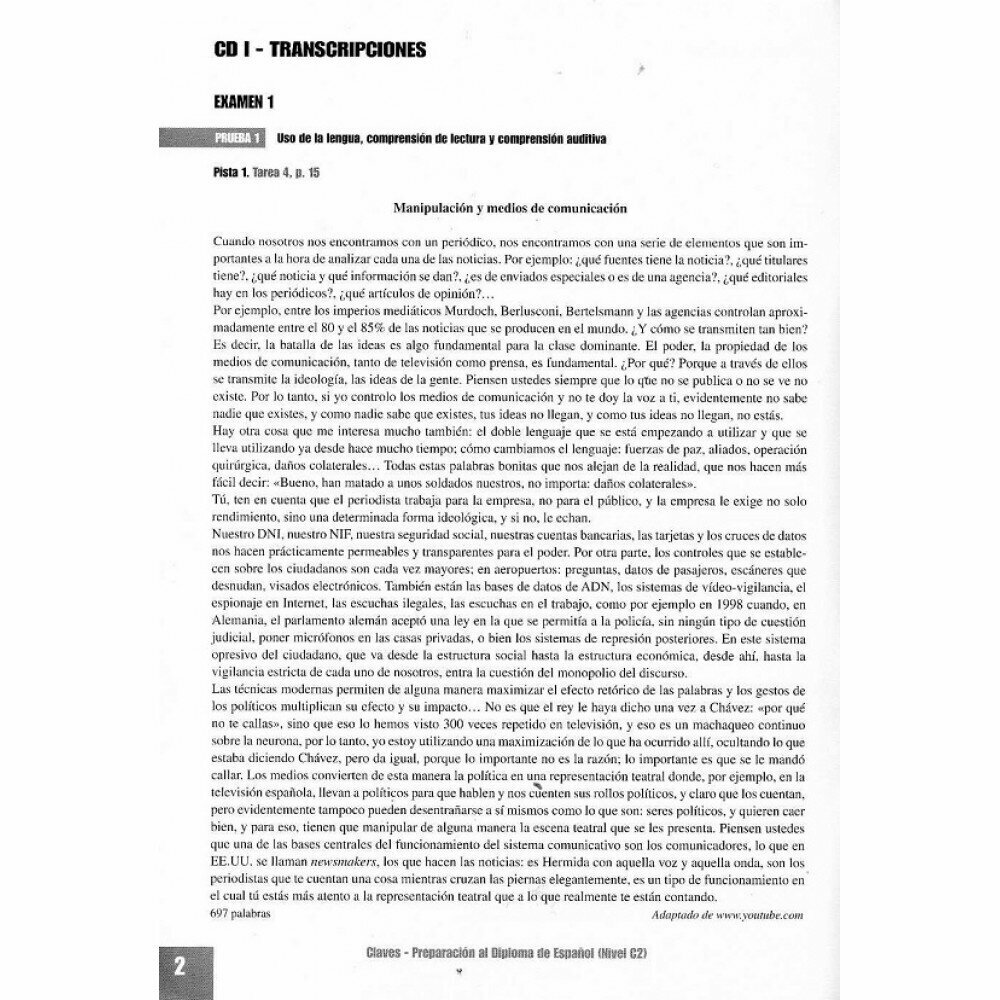 Las transcripciones de la prueba 1, Uso de la lengua, comprension de lectura y comprension auditiva, y de la prueba 2, Destrezas integradas: comprension auditiva y de lectura y expresion e interaccion escritas.